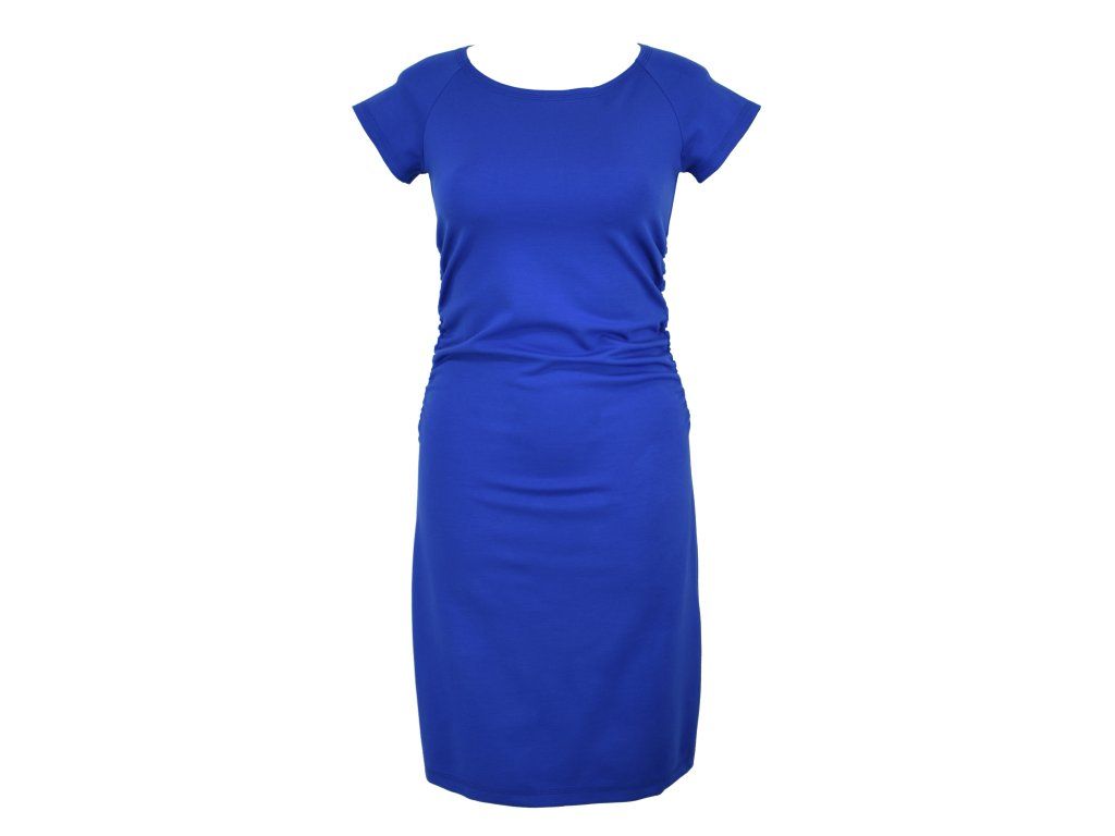 Dámské šaty s řasením v pase, vhodné na denní nošení i formálnější události. Raglánové krátké rukávy. Šaty nemají kapsy.