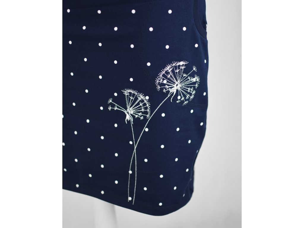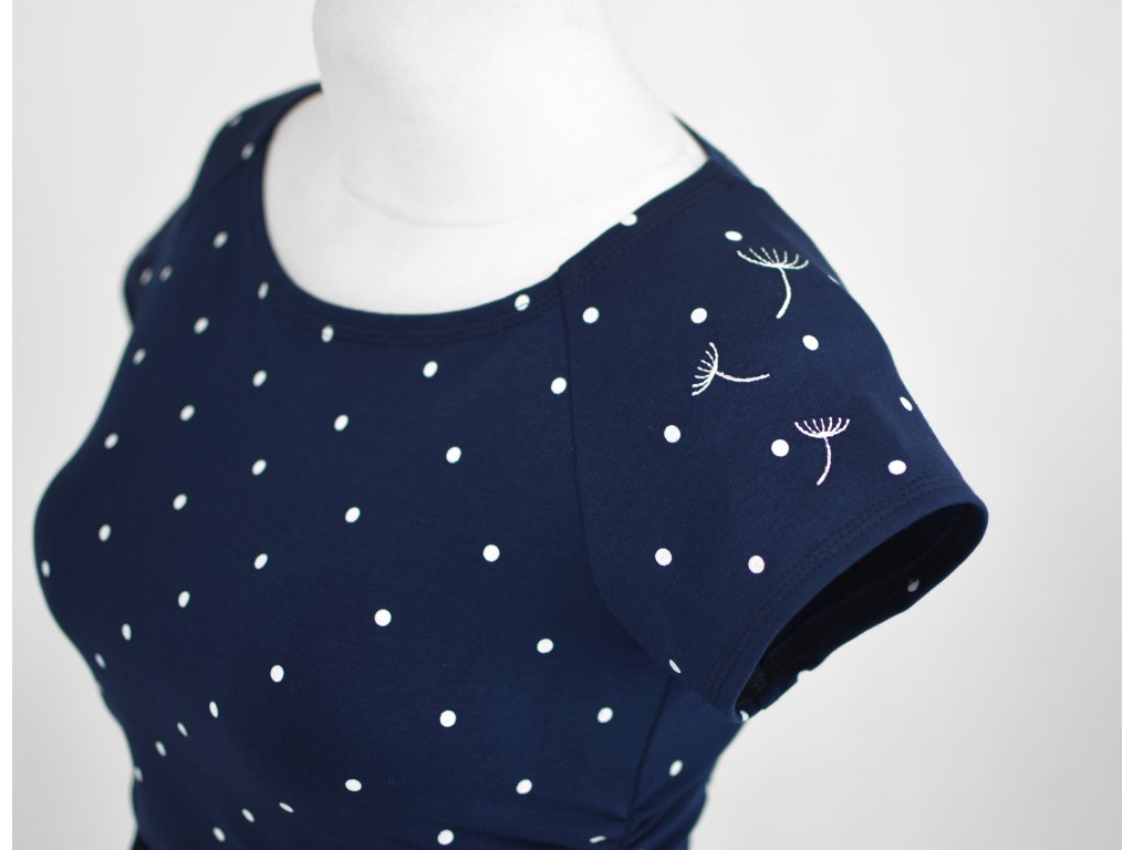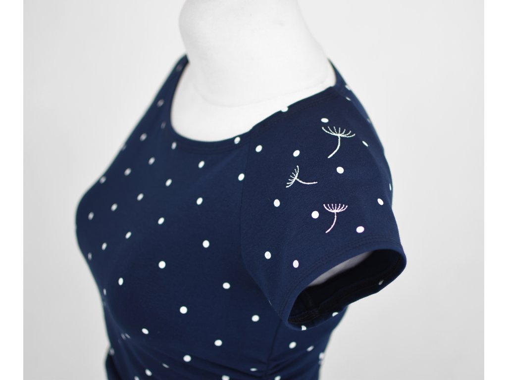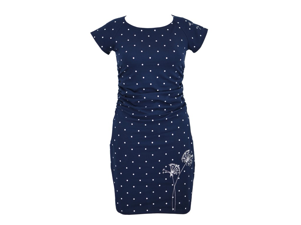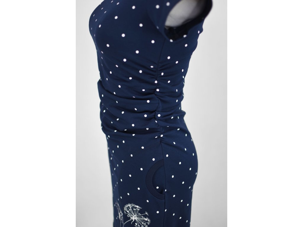 Dámské šaty s řasením v pase, vhodné na denní nošení i formálnější události. Raglánové krátké rukávy. Šaty mají dvě přiznané kapsy v bocích.