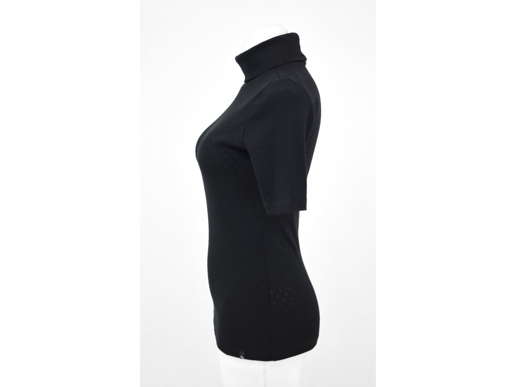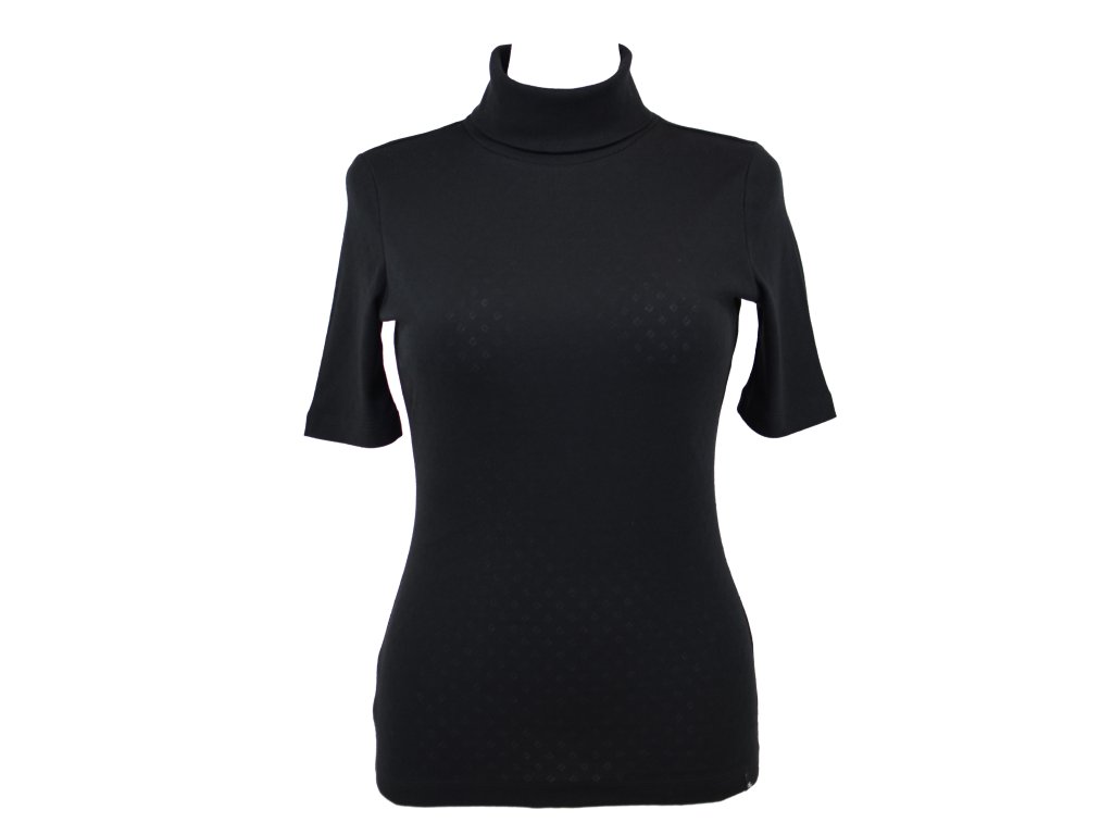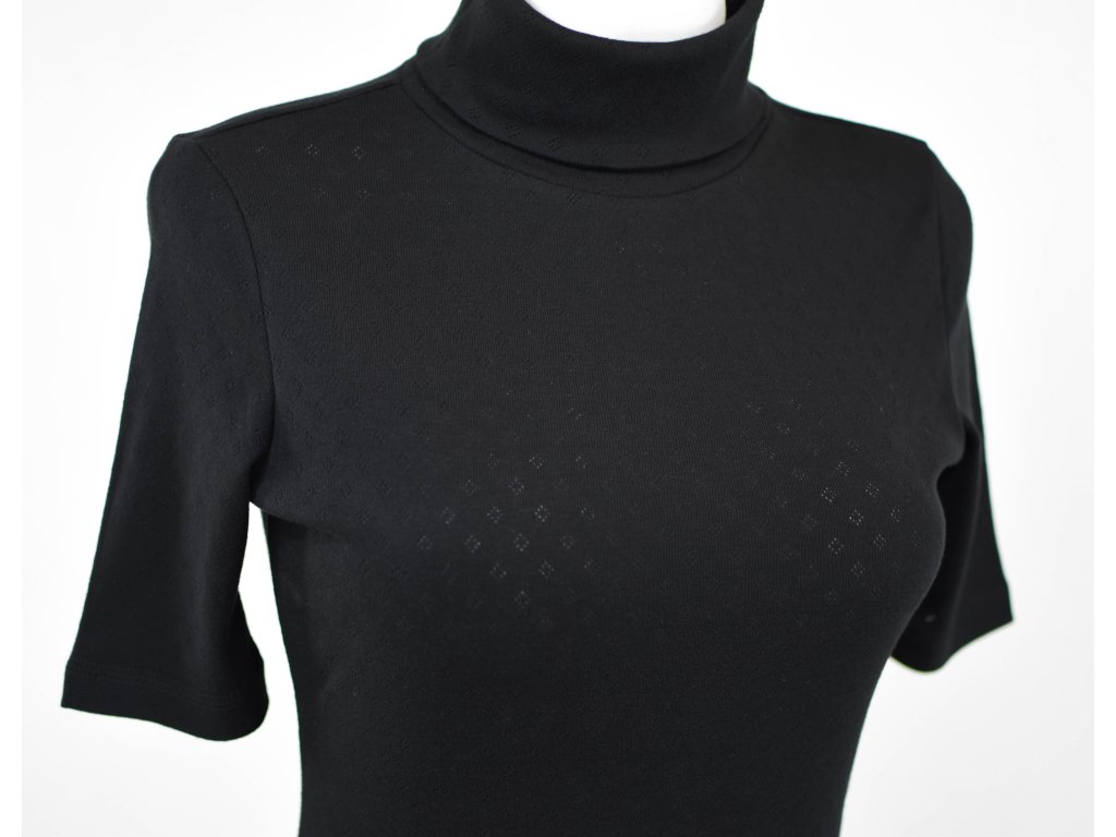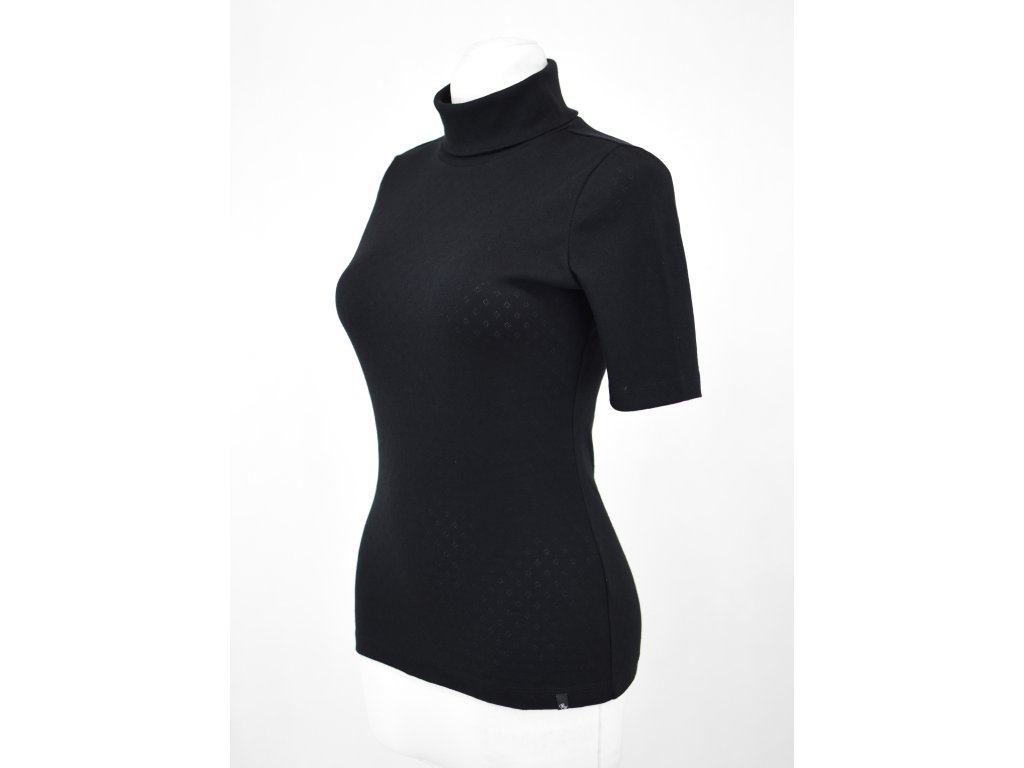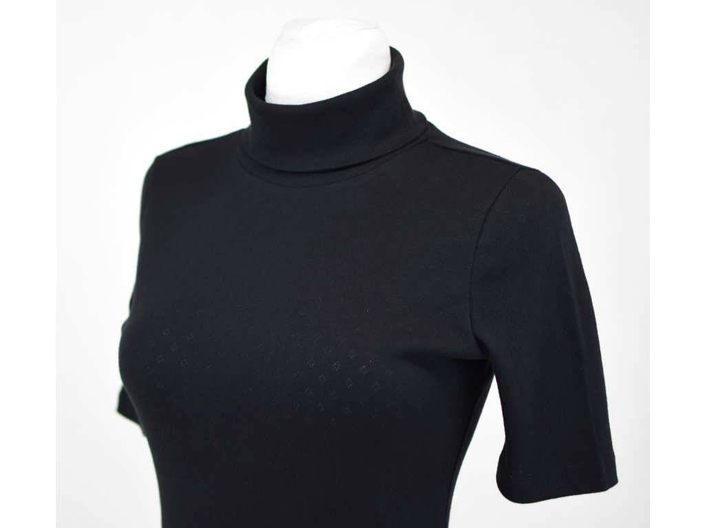 Dámské tričko s nižším stojáčkem / rolákem, projmuté do pasu. Rukávek je delší, ale stále nad loket. :)