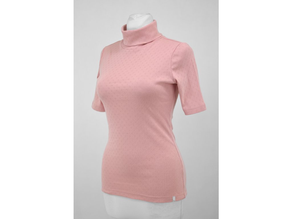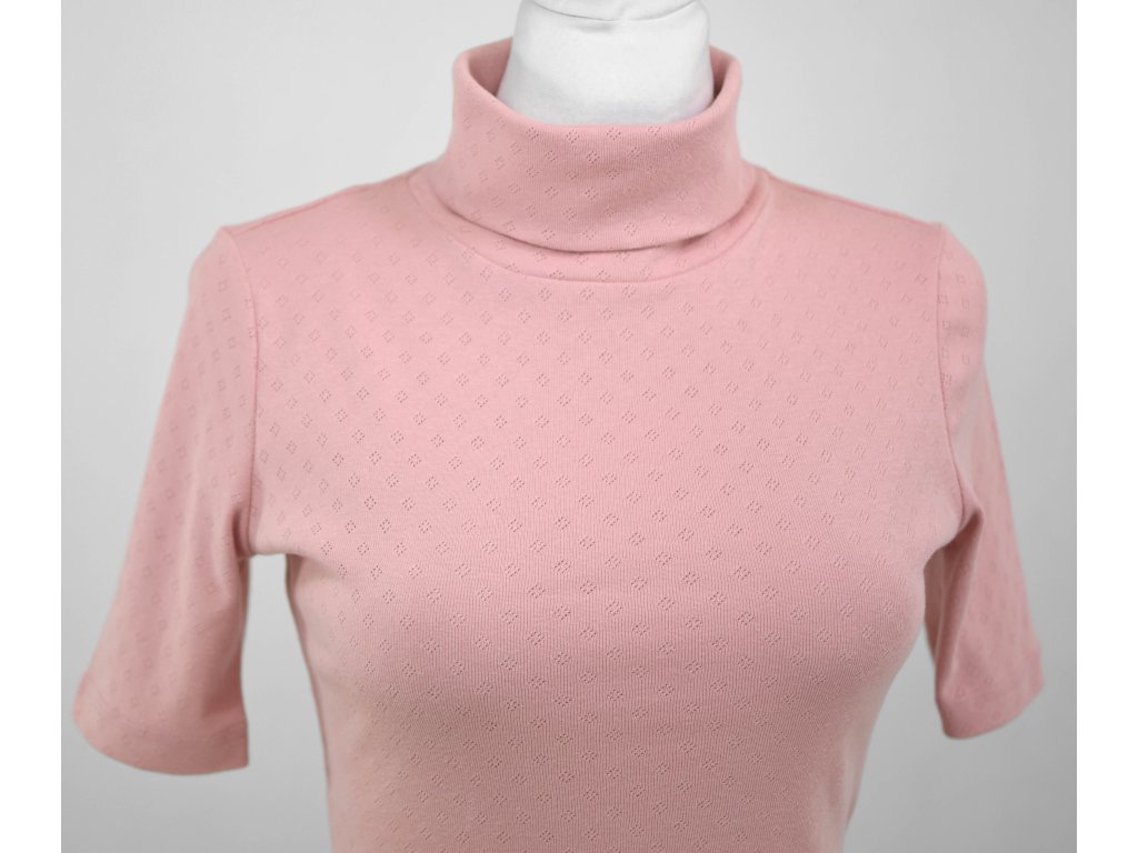 Dámské tričko s nižším stojáčkem / rolákem, projmuté do pasu. Rukávek je delší, ale stále nad loket. :)