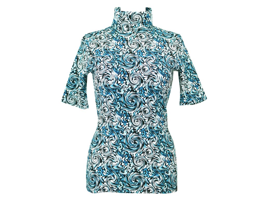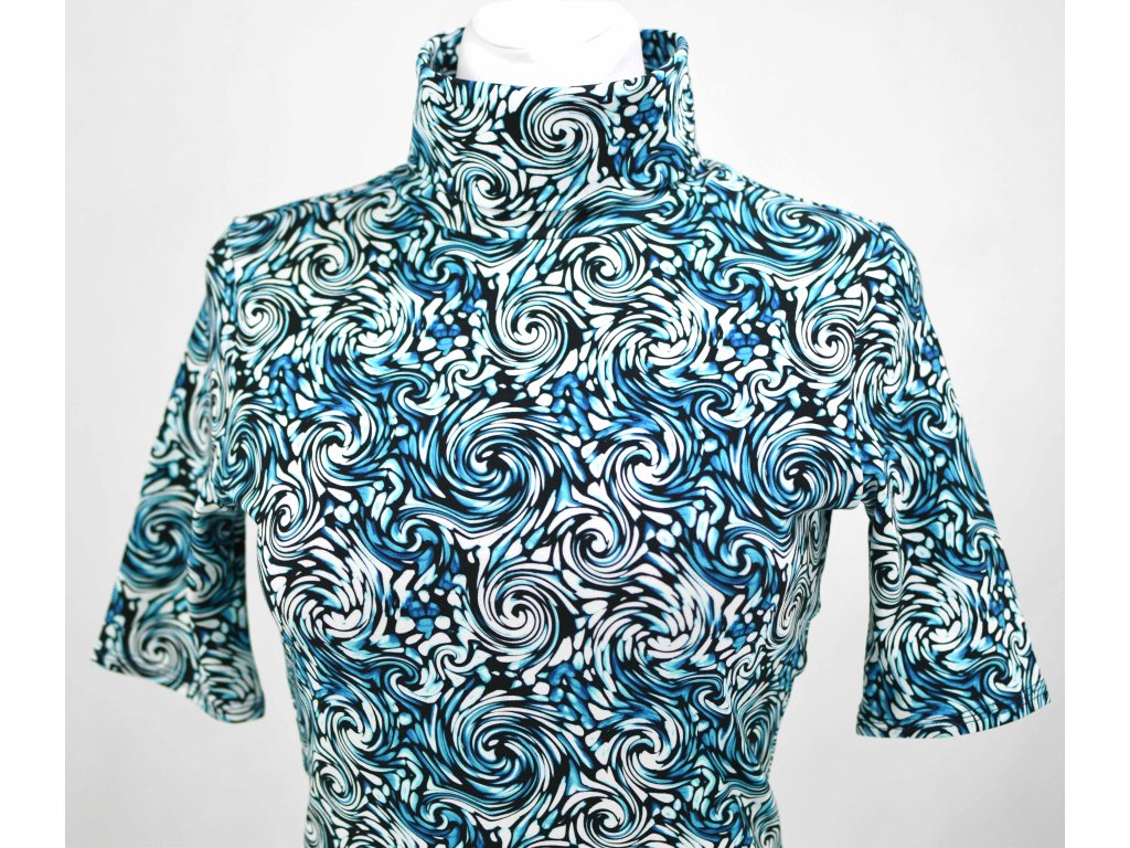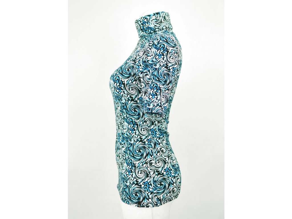 Dámské tričko s nižším stojáčkem / rolákem, projmuté do pasu. Rukávek je delší, ale stále nad loket. :)