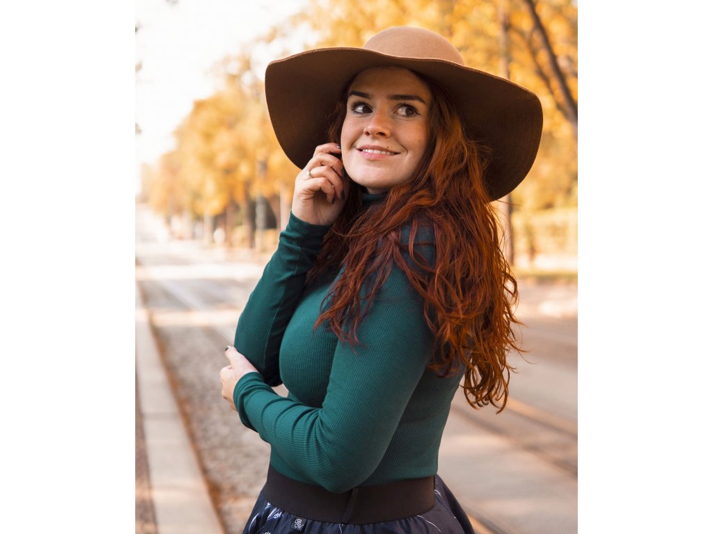 Dámské tričko s nižším stojáčkem / rolákem, projmuté do pasu a s dlouhými rukávy.