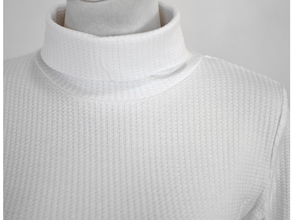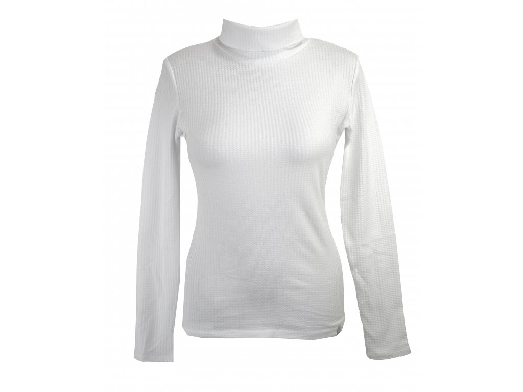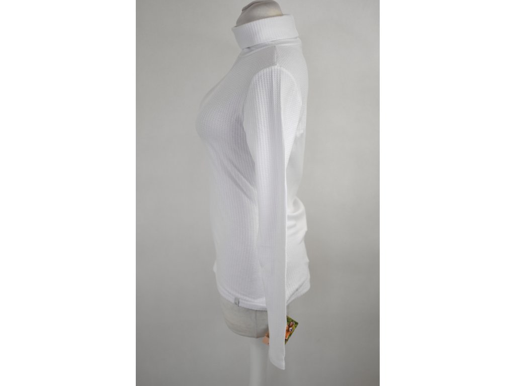 Dámské tričko s nižším stojáčkem / rolákem, projmuté do pasu a s dlouhými rukávy.