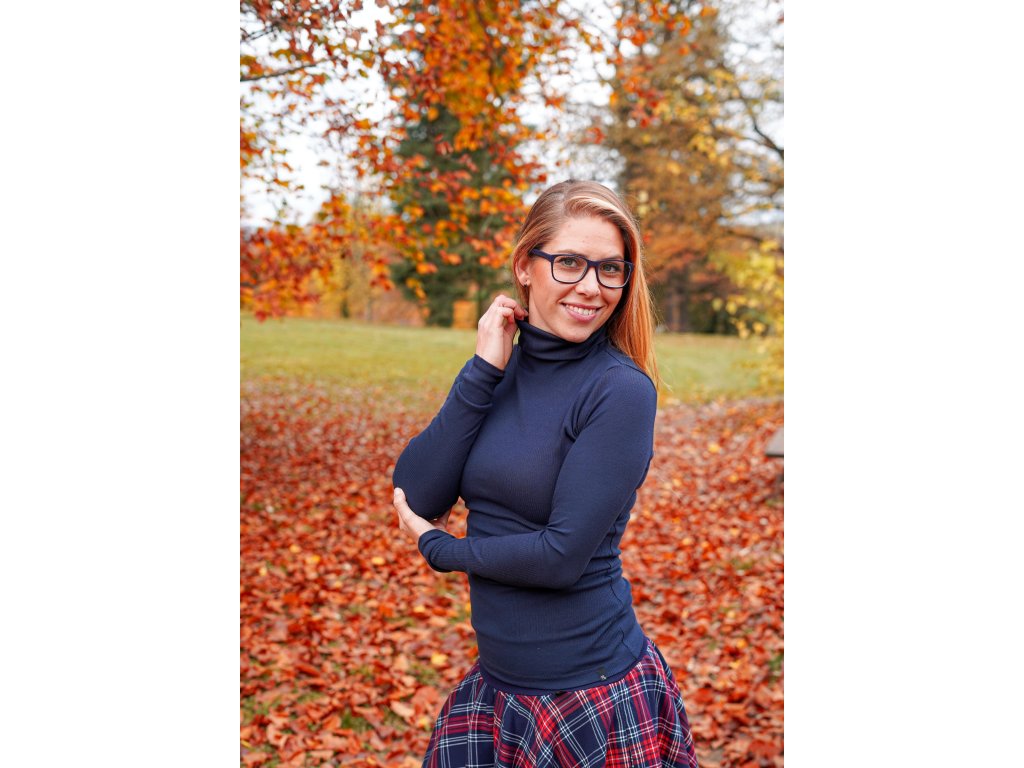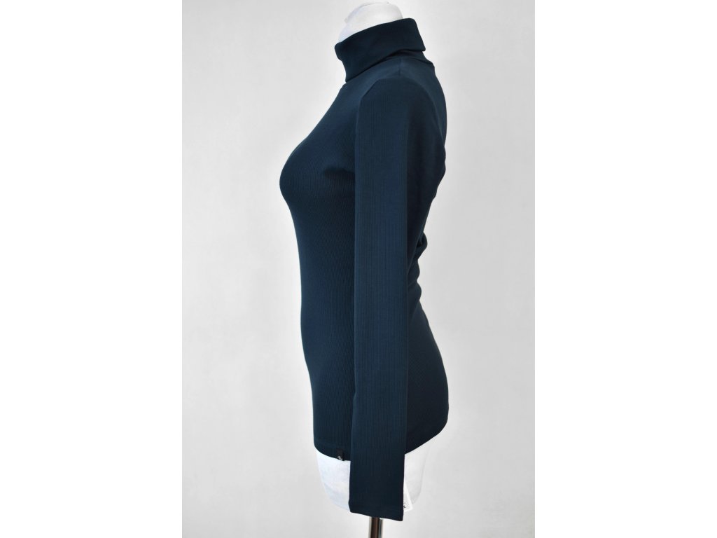Dámské tričko s nižším stojáčkem / rolákem, projmuté do pasu a s dlouhými rukávy.