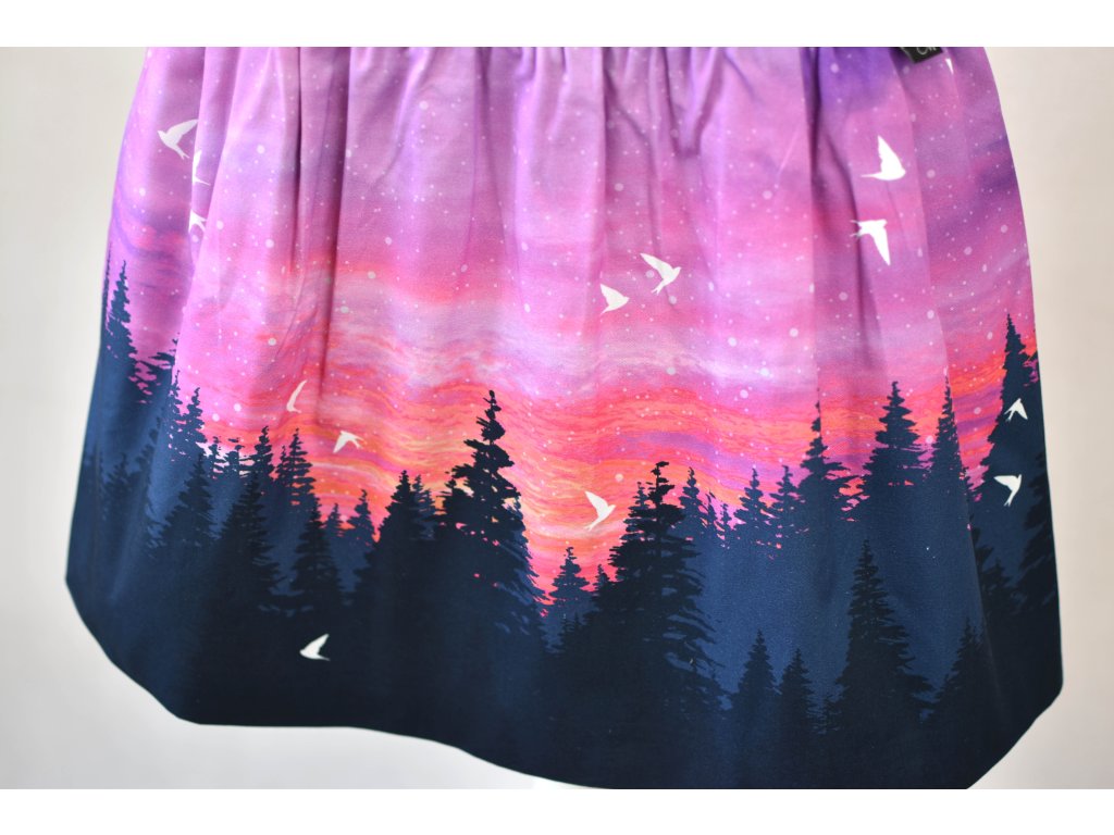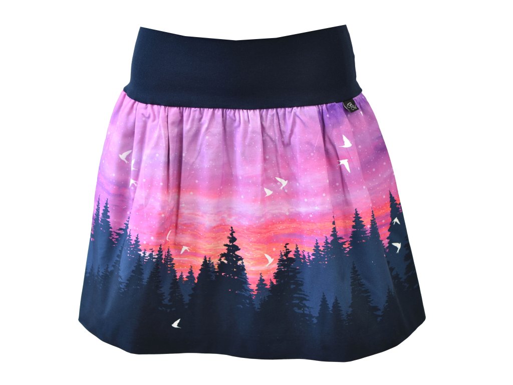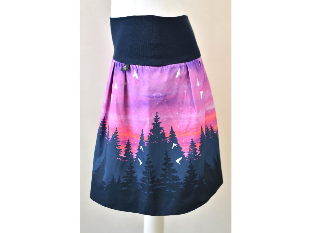 Dámská sukně balonového střihu s ROVNÝM dolním okrajem a s dvojitým elastickým pasovým okrajem vhodným pro většinu velikostí. Podšité polyesterovou látkou, která je vhodná jak na punčochy, tak na holé nohy a sukně se dá nosit celoročně. Z rubu elastického pasu je nechán otvor na případné vložení gumy na zpevnění či stažení pasu (vhodné pro velikost XS).