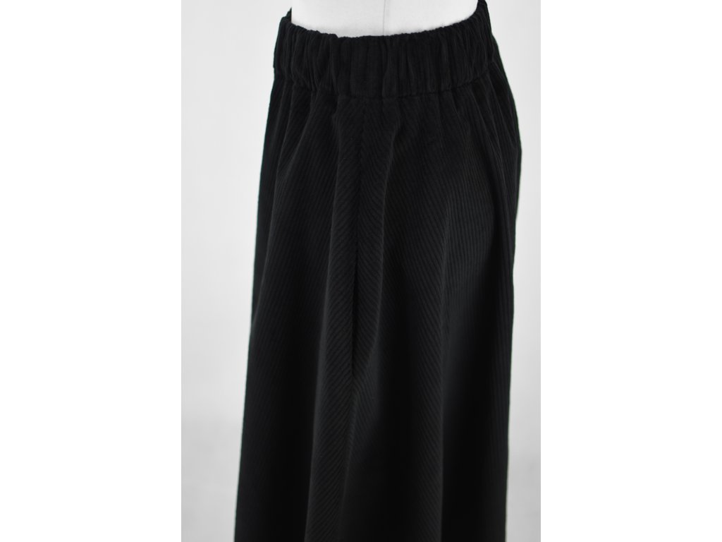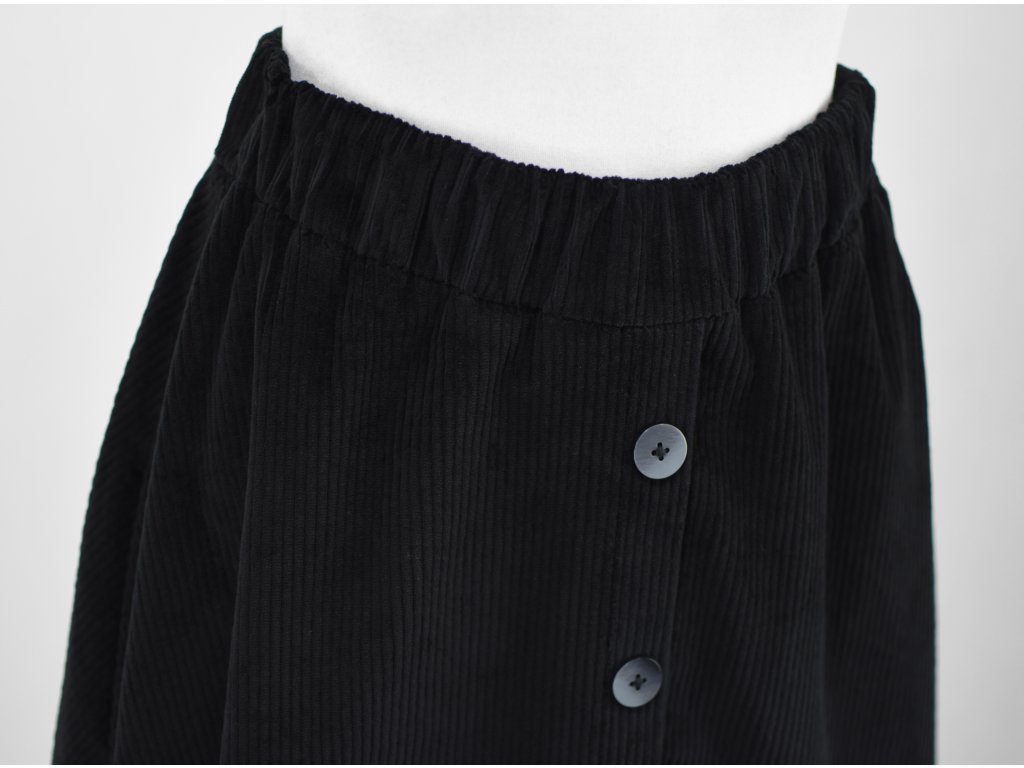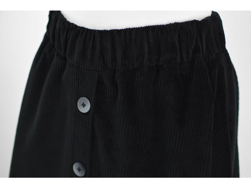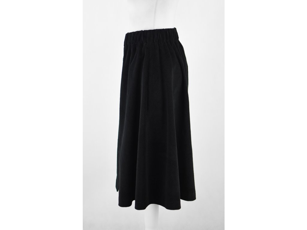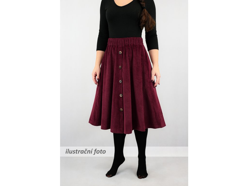 Dámská sukně širšího áčkového střihu s knoflíkovou légou (ta je pouze dekorační, nedá se rozepnout). V pase je na gumu, z rubu pasu je skrytý otvor, kterým se dá vyměnit. Nemá podšívku, dá se i tak nosit na punčochy i holé nohy.  V bocích nesmí chybět dvě skryté kapsy.
