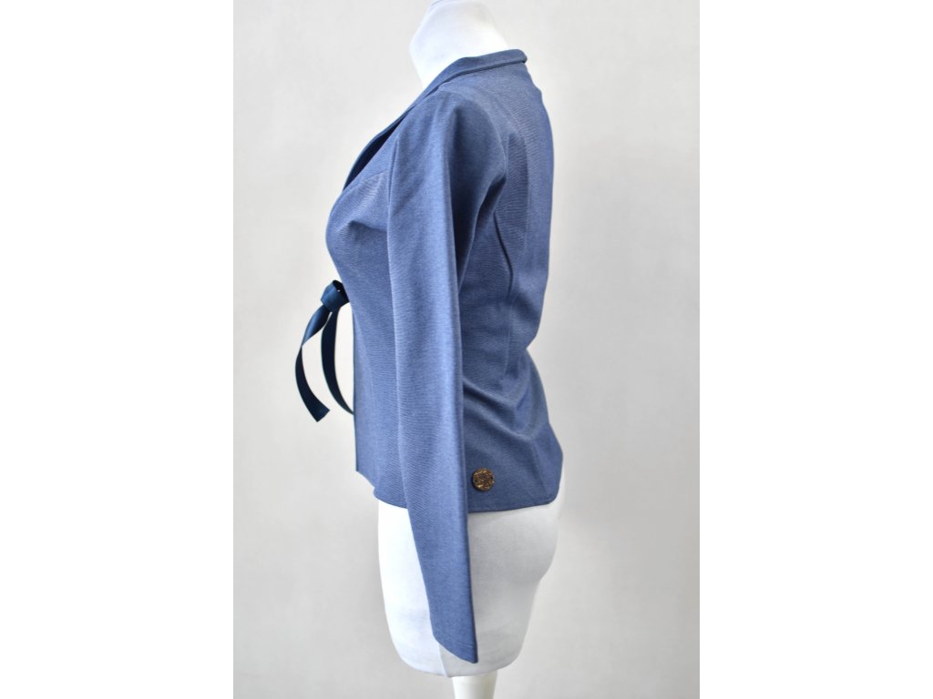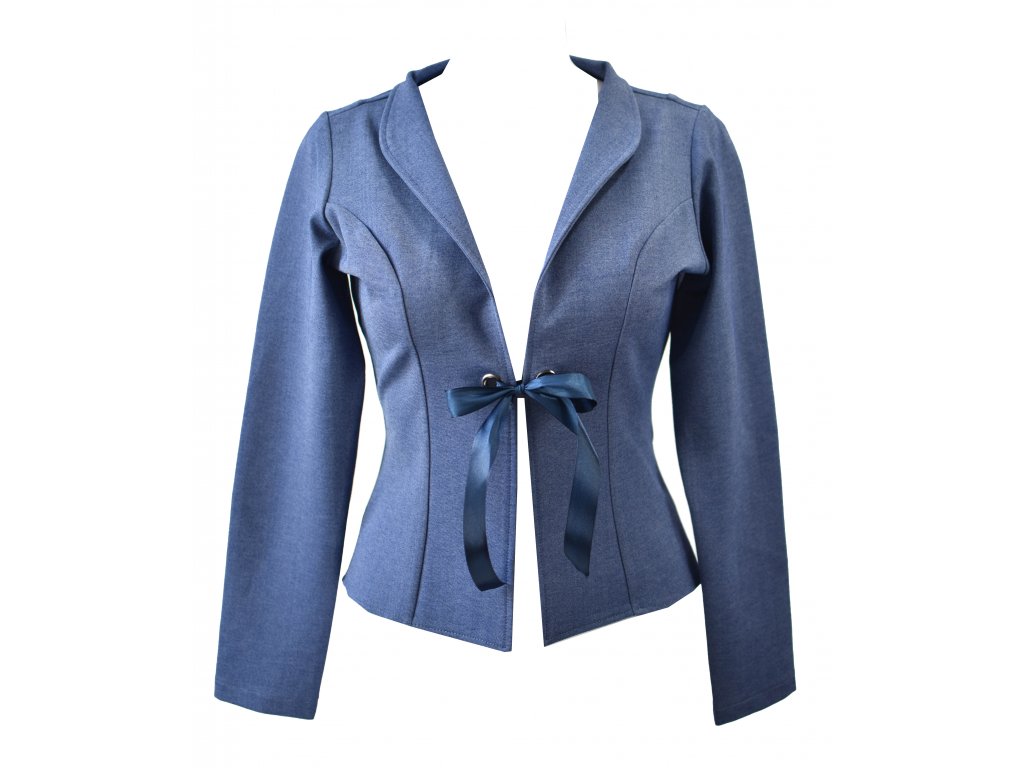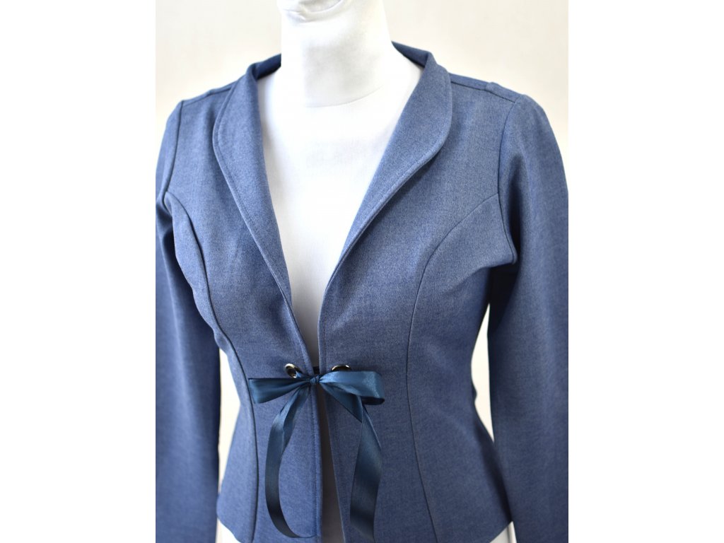 Jak elegantnější tak volnočasové sako je tvarované dvěma švy na předním i zadním dílu, které tvoří siluetu a projmutí do pasu. Sako má malý stojáček. Dá se uvázat pod prsy mašlí, která je protažena dvěmi průchodkami.