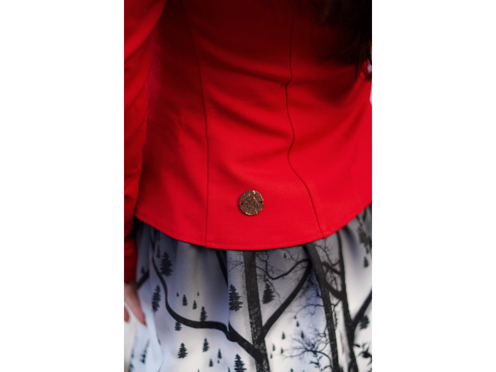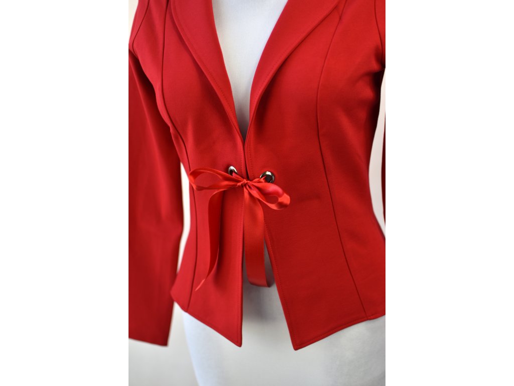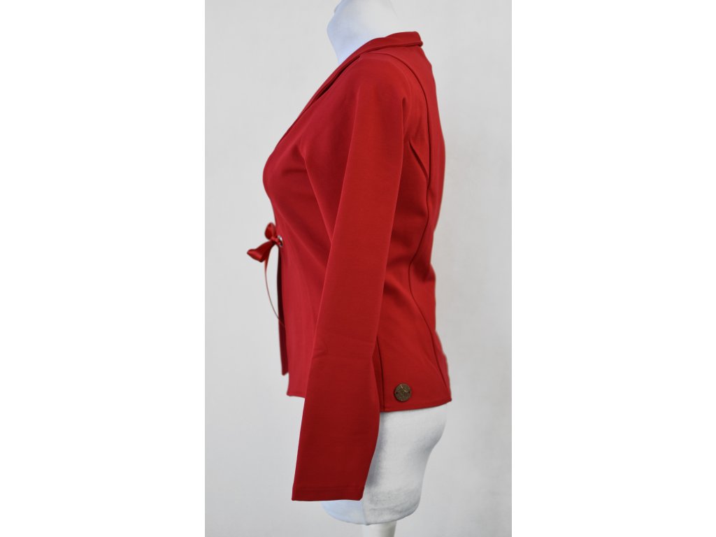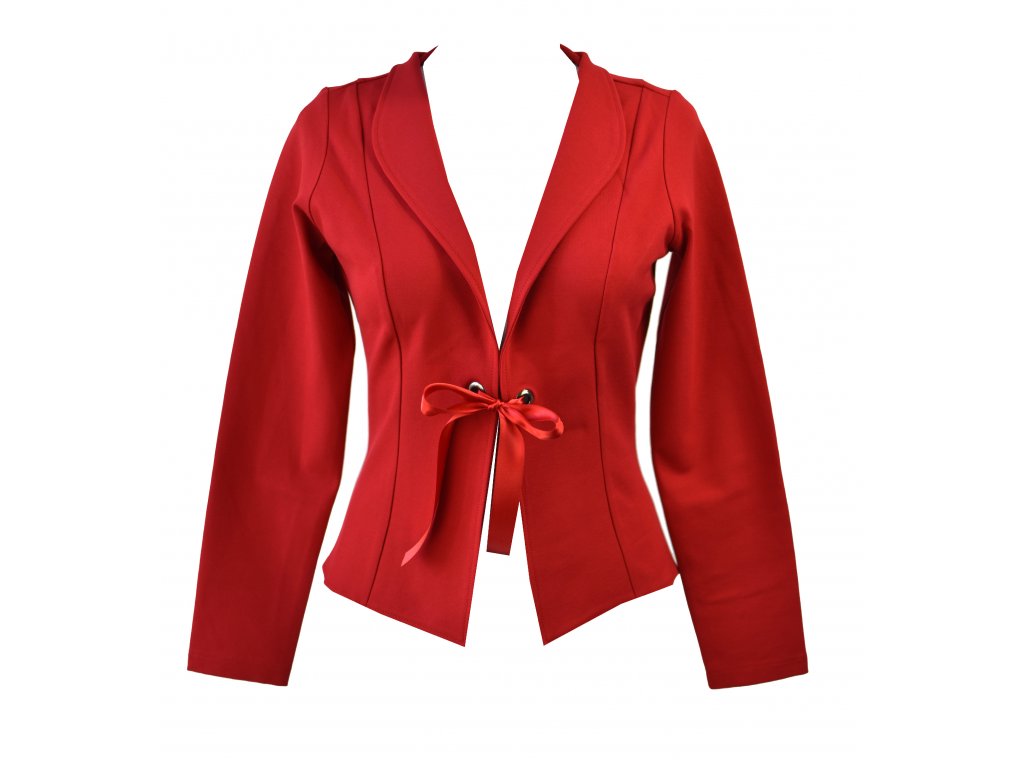 Jak elegantnější tak volnočasové sako je tvarované dvěma švy na předním i zadním dílu, které tvoří siluetu a projmutí do pasu. Sako má malý stojáček. Dá se uvázat pod prsy mašlí, která je protažena dvěmi průchodkami.