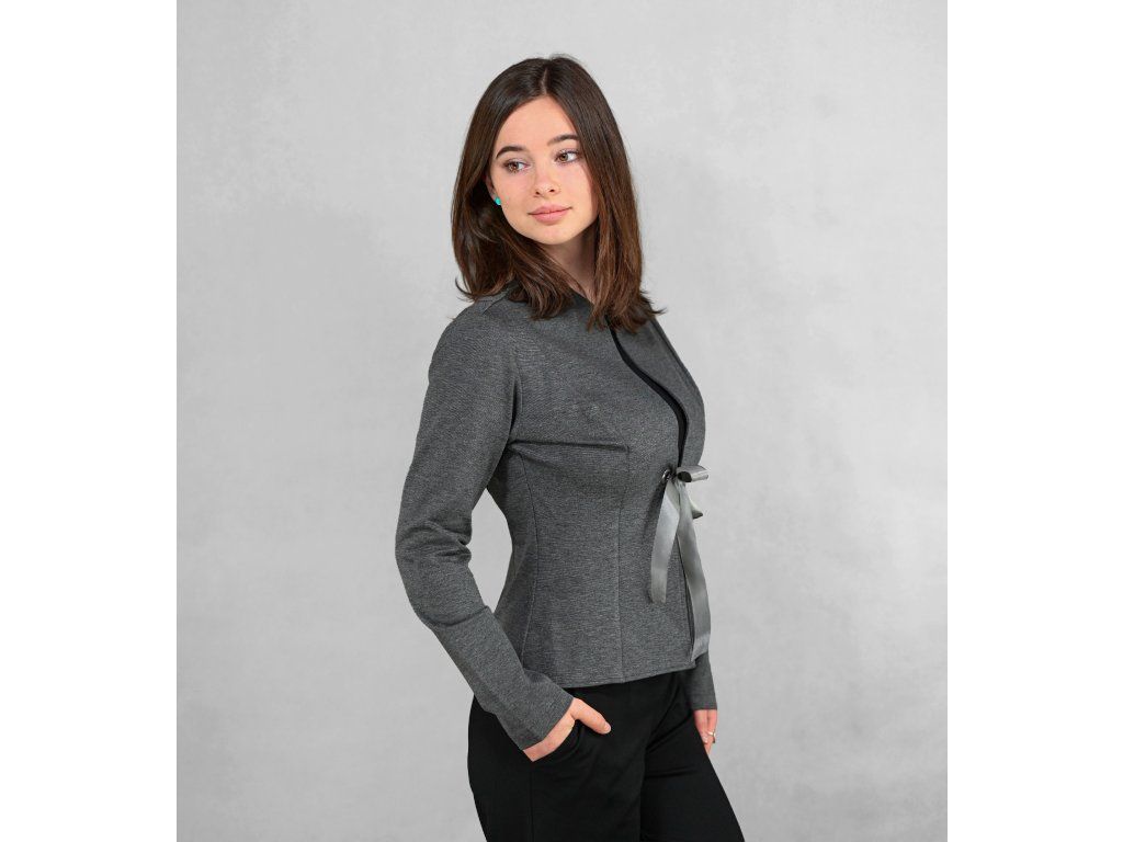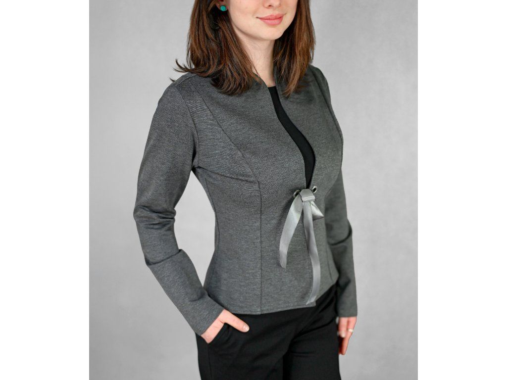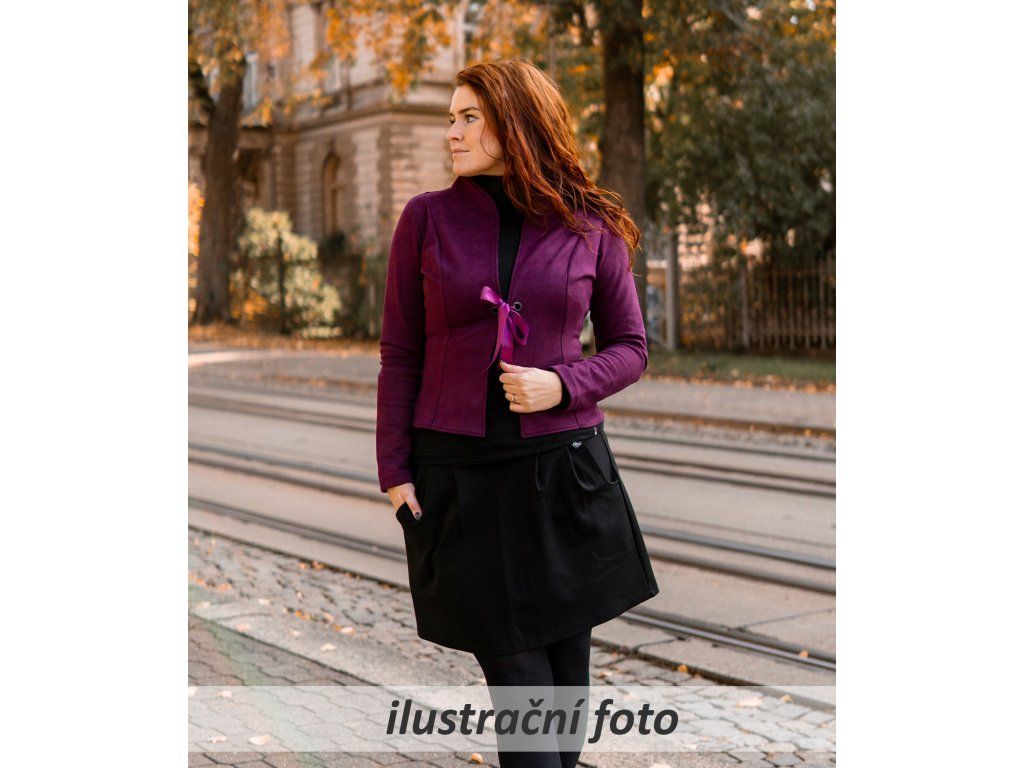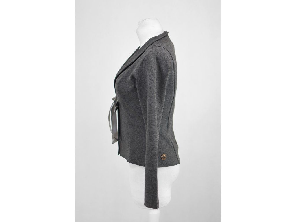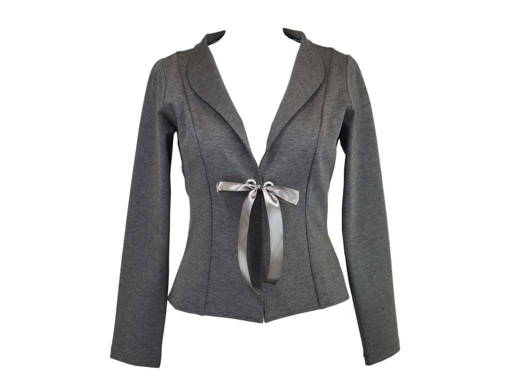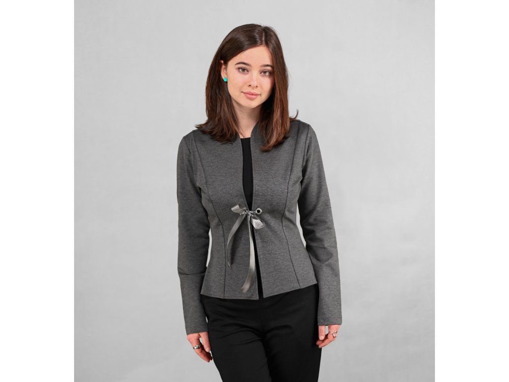 Malý stojáček a zavazování pod prsy pomocí mašle dodávají saku romantický detail. Právě tyto prvky dělají z modelu výrazný, ale stále dobře kombinovatelný kousek. Pevnější elastický materiál je příjemný na nošení, dobře drží tvar a neomezuje v pohybu.
