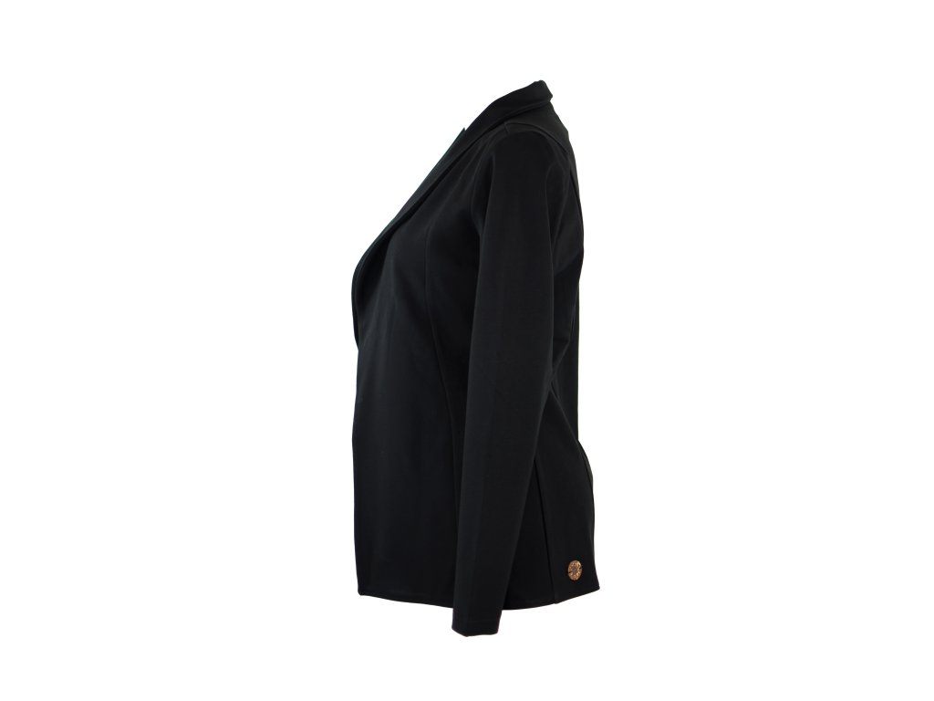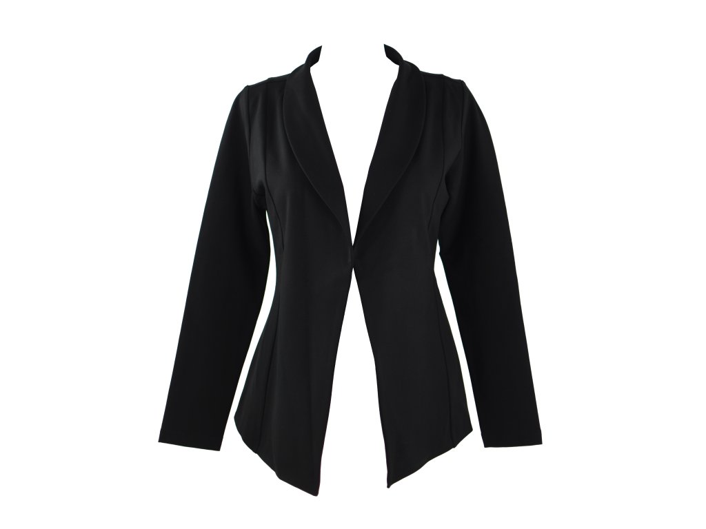 Elegantní i volnočasové sako otevřeného střihu bez zapínání. Je tvarované dvěma švy na předním i zadním dílu, které tvoří siluetu a lehké projmutí do pasu. Má volnější střih. Materiál je pružný, ale zároveň pevnější, drží tvar. Nemá kapsy.