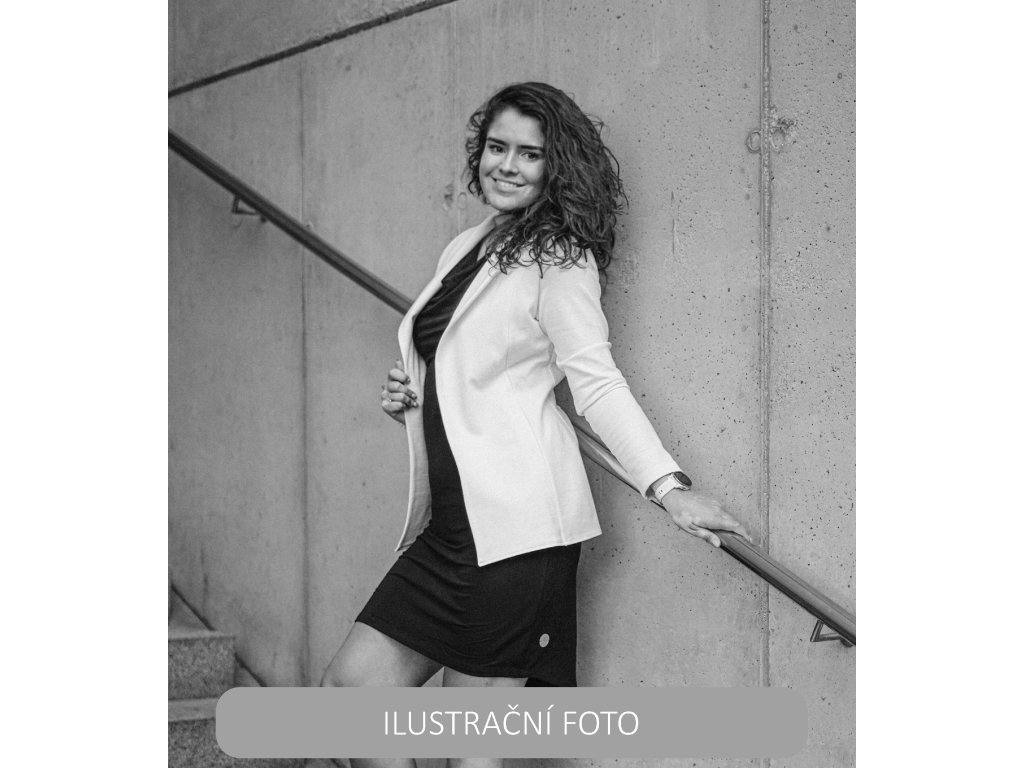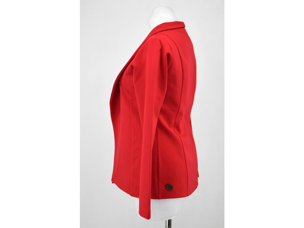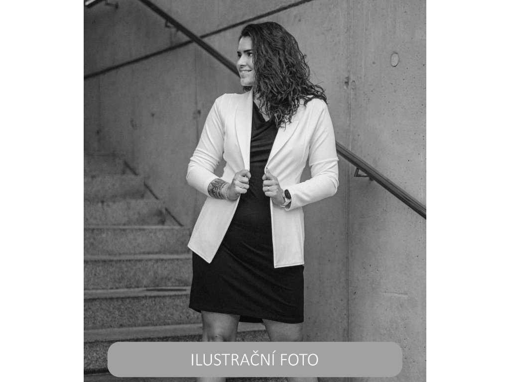 Elegantní i volnočasové sako otevřeného střihu bez zapínání. Je tvarované dvěma švy na předním i zadním dílu, které tvoří siluetu a lehké projmutí do pasu. Má volnější střih. Materiál je pružný, ale zároveň pevnější, drží tvar. Nemá kapsy.