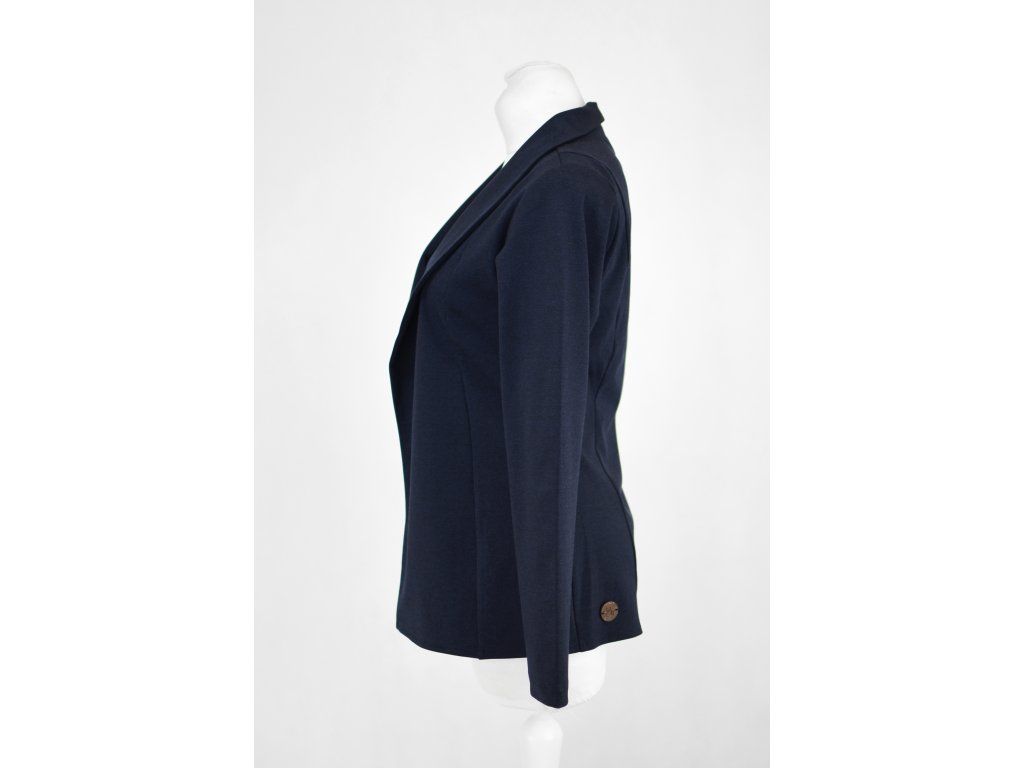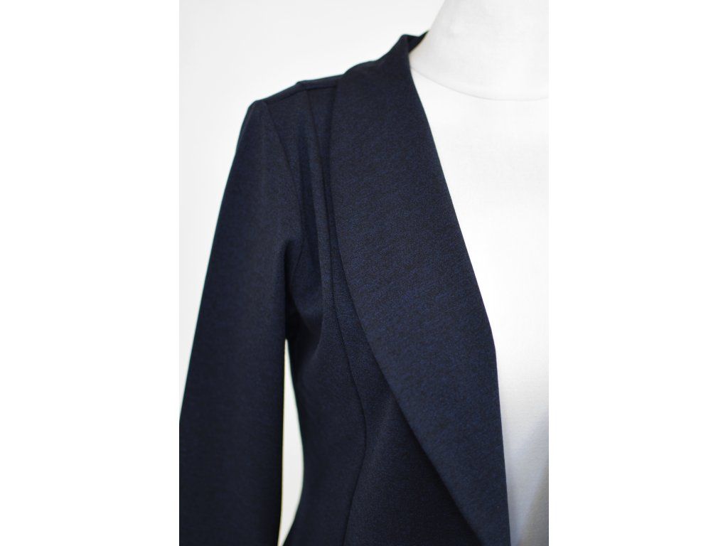 Elegantní i volnočasové sako otevřeného střihu bez zapínání. Je tvarované dvěma švy na předním i zadním dílu, které tvoří siluetu a lehké projmutí do pasu. Má volnější střih. Materiál je pružný, ale zároveň pevnější, drží tvar. Nemá kapsy.