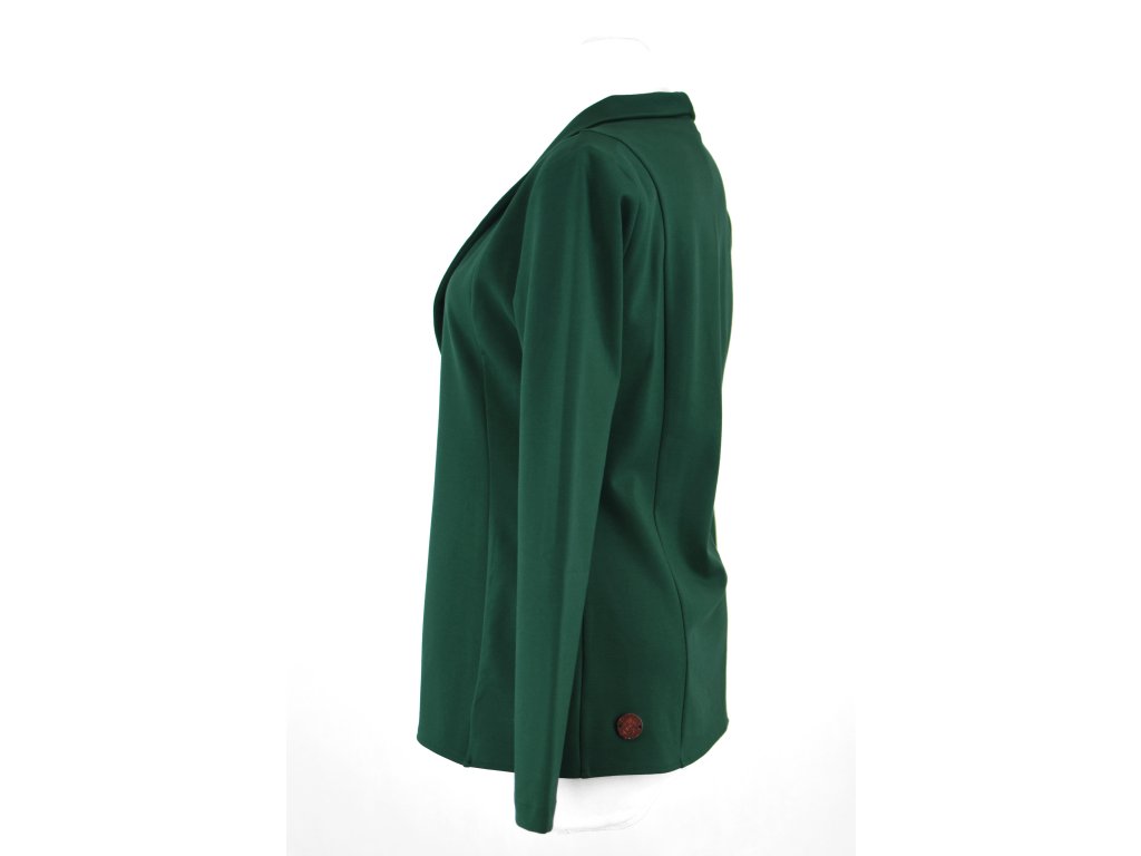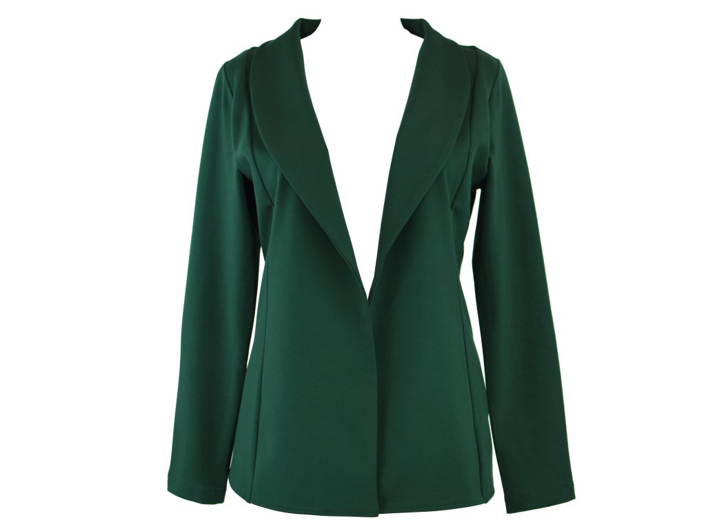 Elegantní i volnočasové sako otevřeného střihu bez zapínání. Je tvarované dvěma švy na předním i zadním dílu, které tvoří siluetu a lehké projmutí do pasu. Má volnější střih. Materiál je pružný, ale zároveň pevnější, drží tvar. Nemá kapsy.
