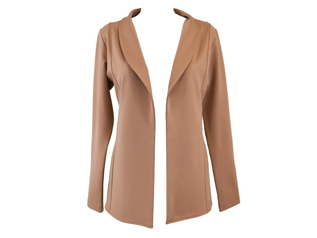 Elegantní i volnočasové sako otevřeného střihu bez zapínání. Je tvarované dvěma švy na předním i zadním dílu, které tvoří siluetu a lehké projmutí do pasu. Má volnější střih. Materiál je pružný, ale zároveň pevnější, drží tvar. Nemá kapsy.