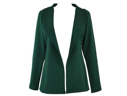 Elegantní i volnočasové sako otevřeného střihu bez zapínání. Je tvarované dvěma švy na předním i zadním dílu, které tvoří siluetu a lehké projmutí do pasu. Má volnější střih. Materiál je pružný, ale zároveň pevnější, drží tvar. Nemá kapsy.