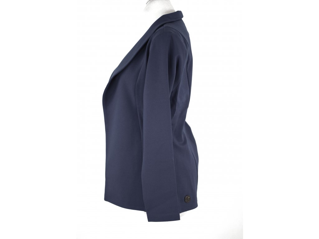 Elegantní i volnočasové sako otevřeného střihu bez zapínání. Je tvarované dvěma švy na předním i zadním dílu, které tvoří siluetu a lehké projmutí do pasu. Má volnější střih. Materiál je pružný, ale zároveň pevnější, drží tvar. Nemá kapsy.