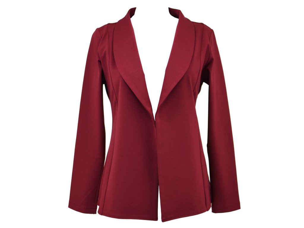 Elegantní i volnočasové sako otevřeného střihu bez zapínání. Je tvarované dvěma švy na předním i zadním dílu, které tvoří siluetu a lehké projmutí do pasu. Má volnější střih. Materiál je pružný, ale zároveň pevnější, drží tvar. Nemá kapsy.