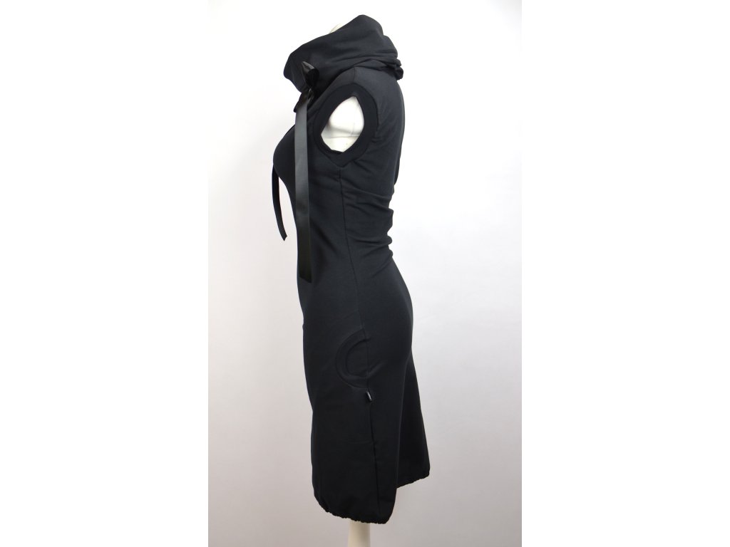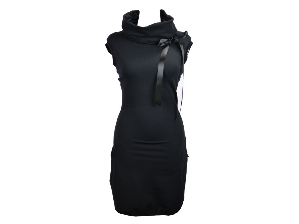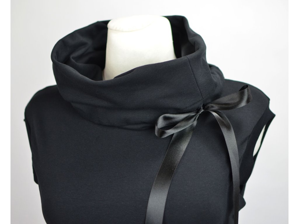 Dámská šatovka projmutá v pase a volnější přes boky. Má přinechané rukávky lemované úpletem s více vykrojeným průramkem, aby se dala vrstvit, dole je stažená do gumičky.