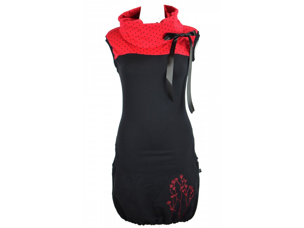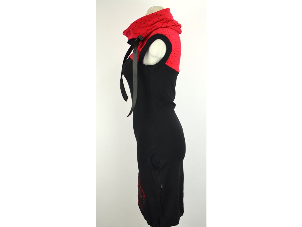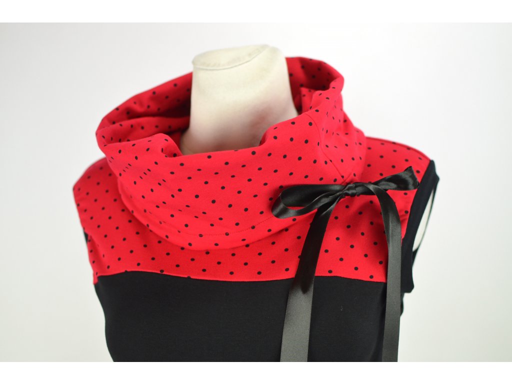 Dámská šatovka projmutá v pase a volnější přes boky. Má přinechané rukávky lemované úpletem s více vykrojeným průramkem, aby se dala vrstvit, dole je stažená do gumičky.