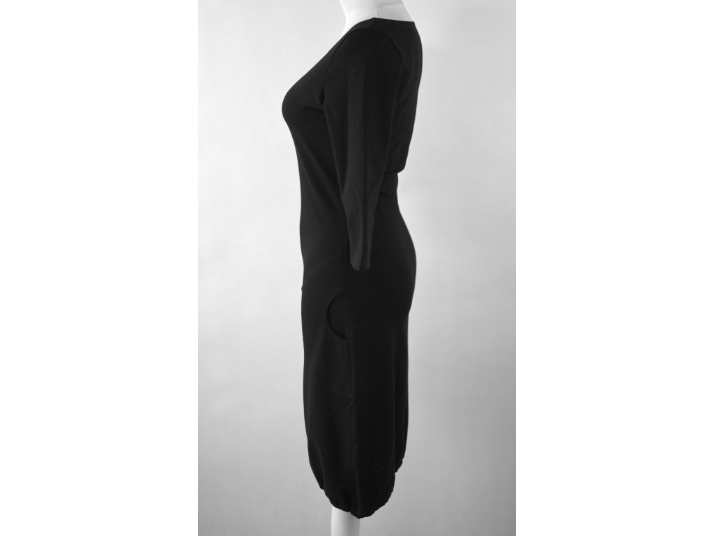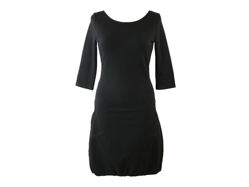 Dámské šaty vycházející z naší šatovky s přidanými 3/4rukávy. Projmuté do pasu a volnějšími boky, dole stažené do gumičky (otvorem ji můžete vyndat nebo povolit/utáhnout).