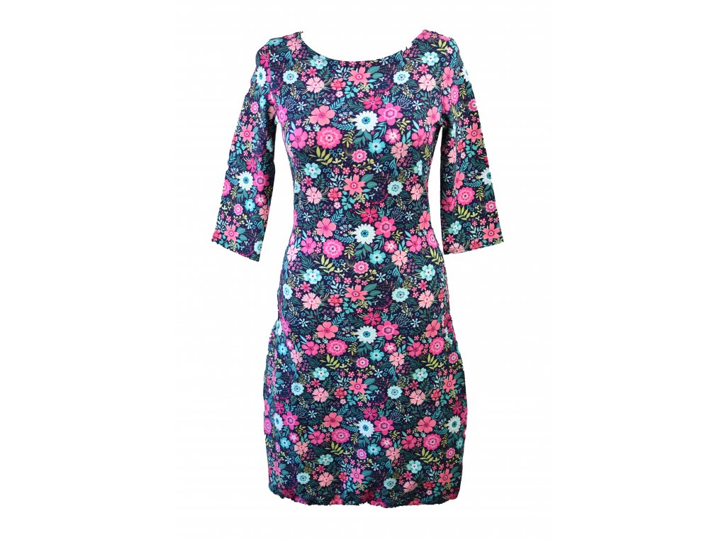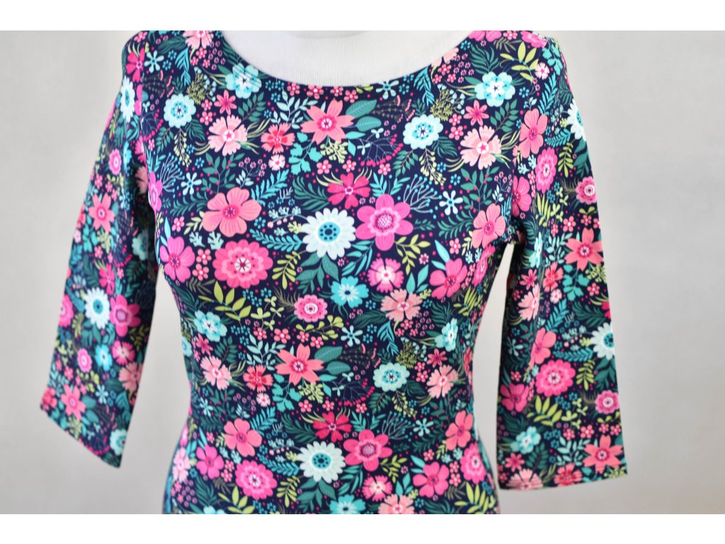 Dámské šaty vycházející z naší šatovky s přidanými 3/4rukávy. Projmuté do pasu a volnějšími boky, dole stažené do gumičky (otvorem ji můžete vyndat nebo povolit/utáhnout).