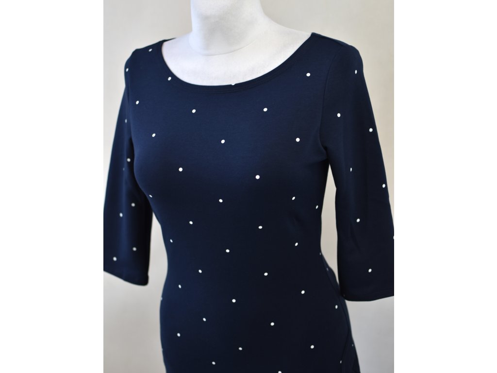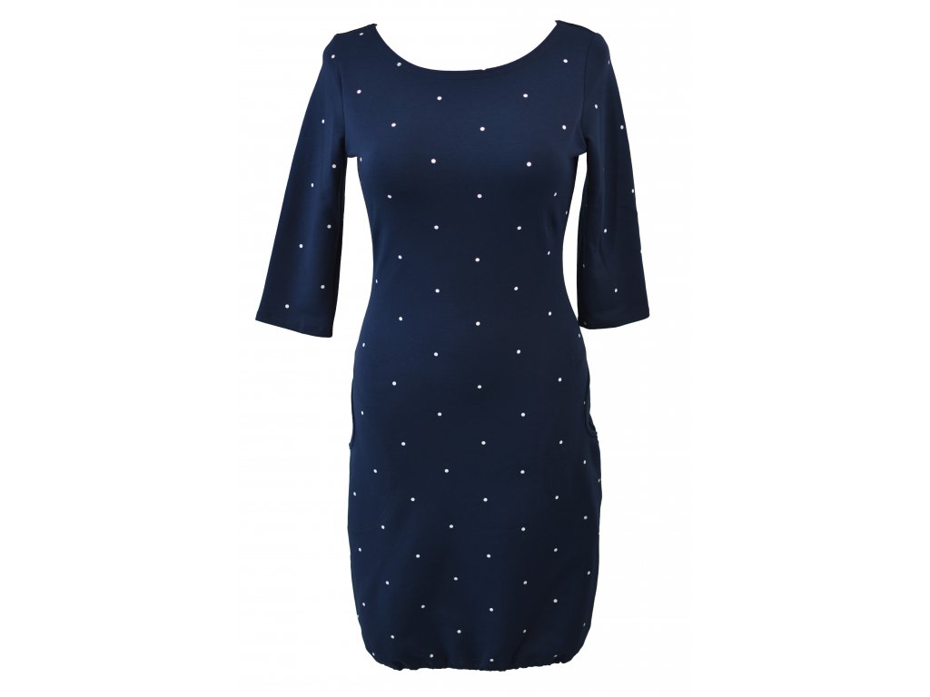 Dámské šaty vycházející z naší šatovky s přidanými 3/4rukávy. Projmuté do pasu a volnějšími boky, dole stažené do gumičky (otvorem ji můžete vyndat nebo povolit/utáhnout).