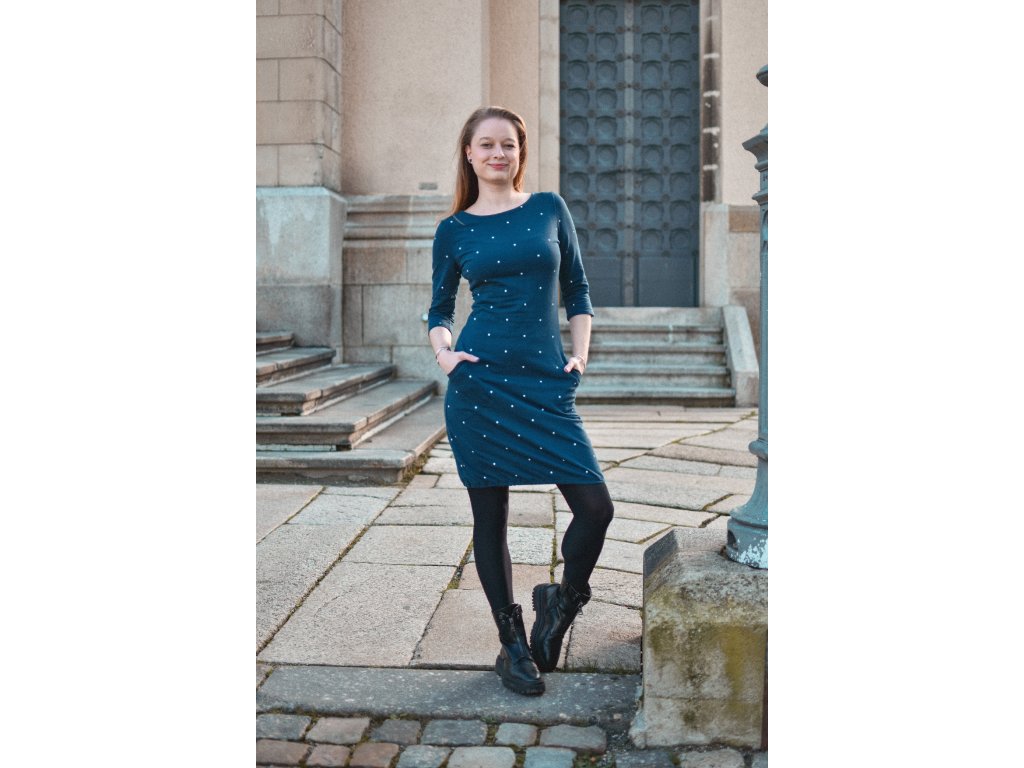 Dámské šaty vycházející z naší šatovky s přidanými 3/4rukávy. Projmuté do pasu a volnějšími boky, dole stažené do gumičky (otvorem ji můžete vyndat nebo povolit/utáhnout).