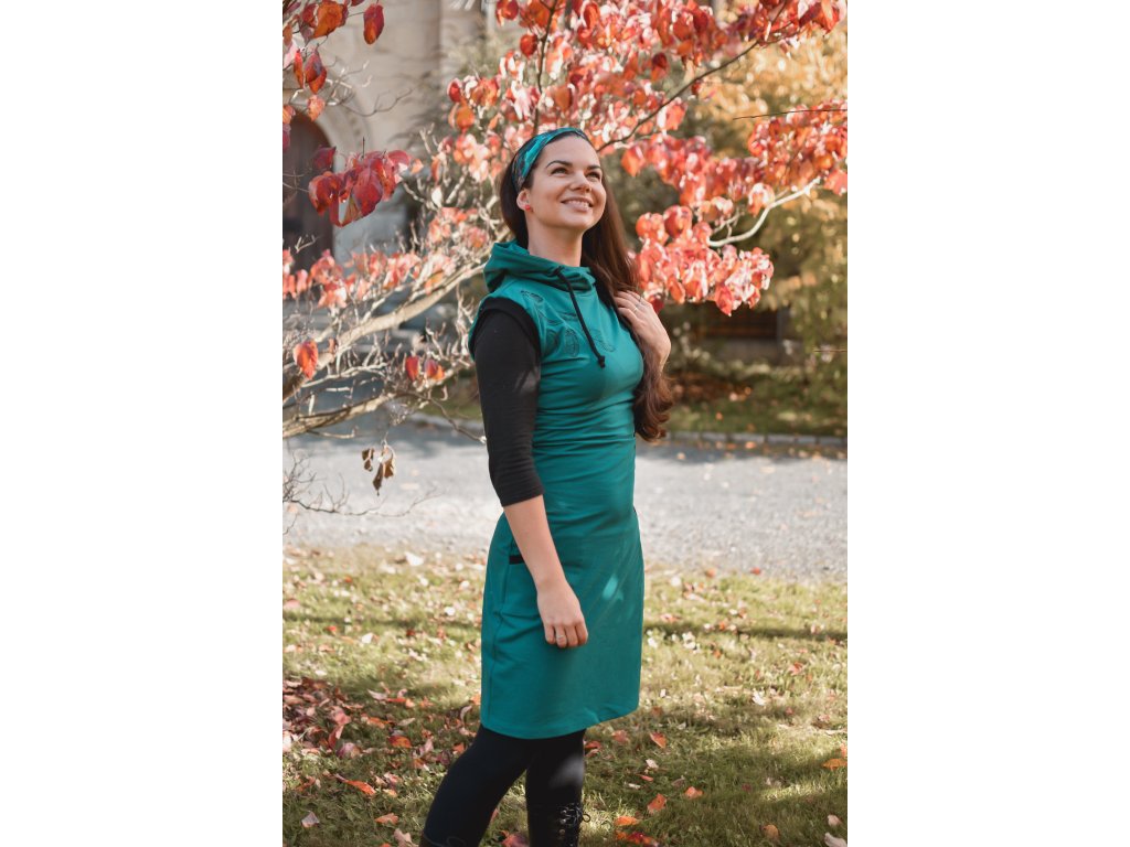Dámská šatovka s kapucí, projmutá do pasu a s volnějšími boky. Má přinechané rukávky lemované úpletem s dostatečným prostorem na vrstvení, dole je stažená gumičkou provlečenou ve švu (dá se vyndat otvorem z rubu). Šatovka je určená k vrstvení – podvléknete tričkem a punčochami nebo legínami a hurá do světa. Skvěle se unosí s tričky všemožných barev nebo s barevnými punčochami.