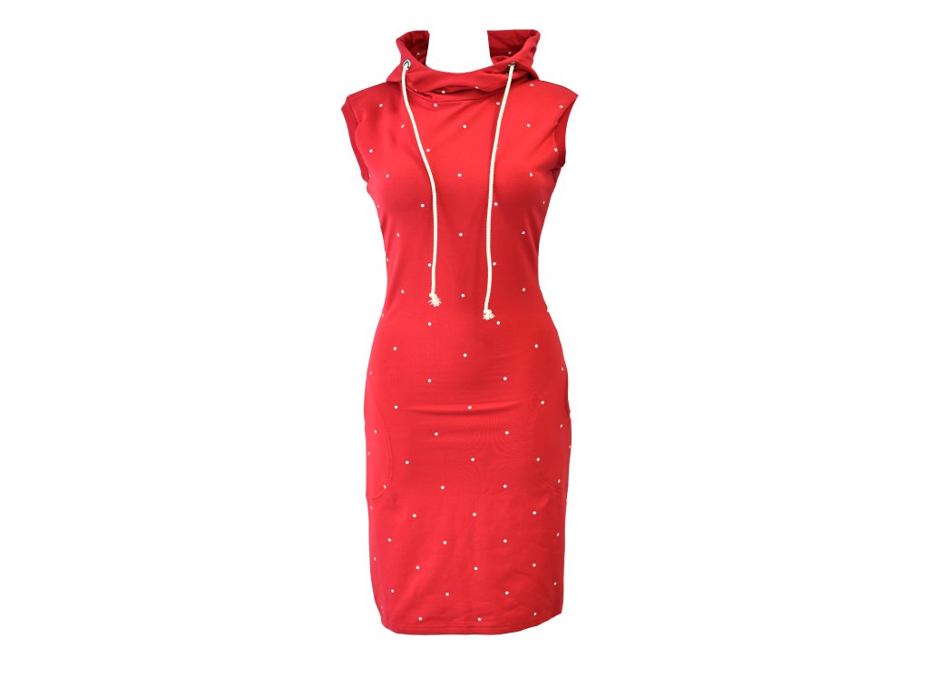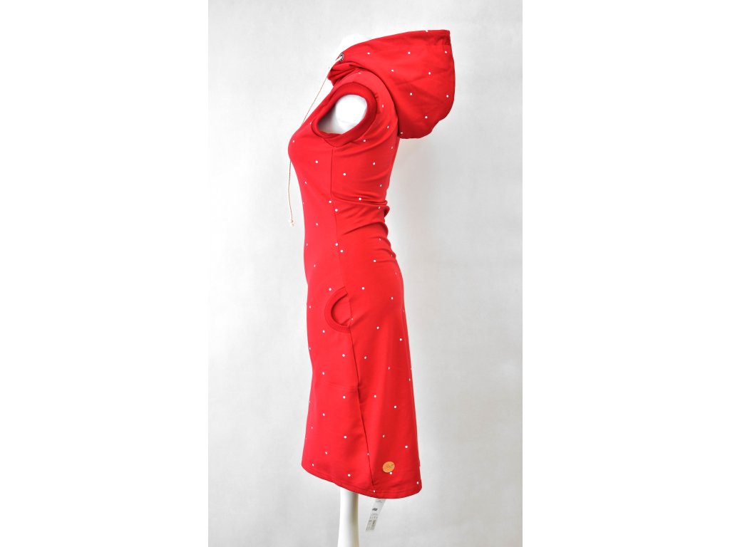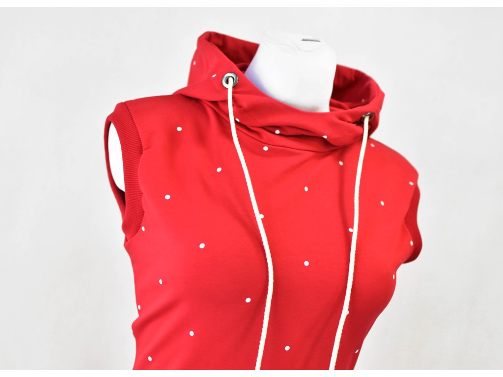 Dámská šatovka projmutá do pasu a volnějšími boky. Má přinechané rukávky lemované úpletem s dostatečným prostorem na vrstvení, dole je začištěná a zadní díl je prodloužený (jako u mikinových šatů), s kapucí a tkaničkou uvnitř na stažení. Šatovka je určená k vrstvení – podvléknete tričkem a punčochami nebo legínami a hurá do světa. Skvěle se unosí s tričky všemožných barev nebo s barevnými punčochami.