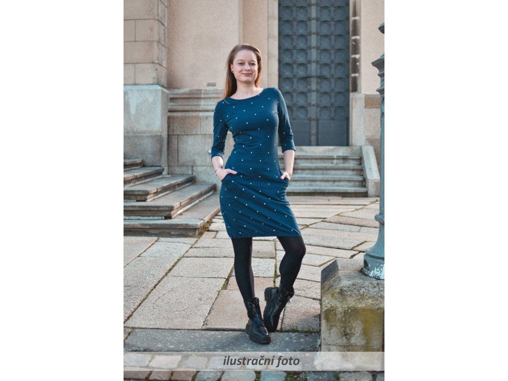 Dámské šaty vycházející z naší šatovky s přidanými 3/4 rukávy. Projmuté do pasu a volnějšími boky, dole stažené do gumičky (otvorem ji můžete vyndat nebo povolit/utáhnout). Kapsy v bocích nesmí chybět. :)