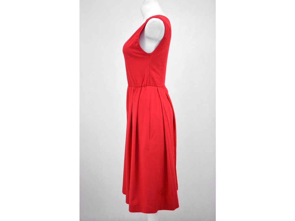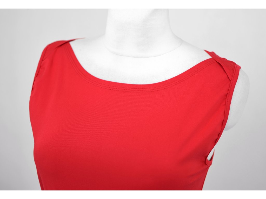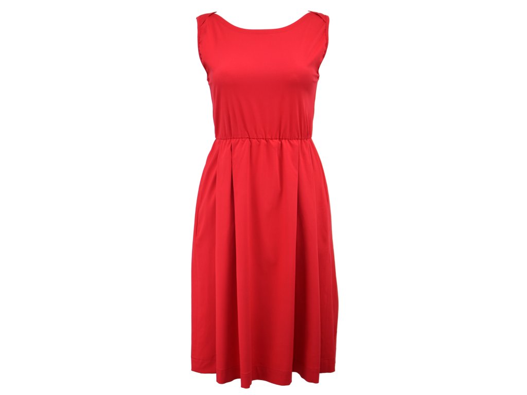Dámské šaty mírně prodloužené délky s podkasáním v pase. Vrchní díl je volnější, ramínka mají zajímavý prvek překřížení. Sukně je široká a volná s osmi velkými sklady. Šaty mají skryté kapsy v bocích.