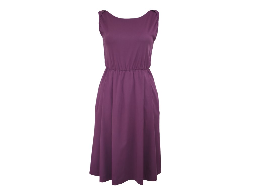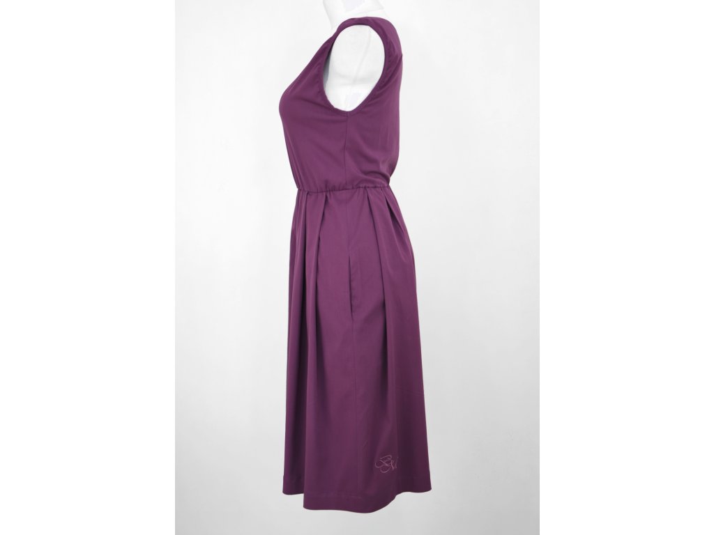 Dámské šaty mírně prodloužené délky s podkasáním v pase. Vrchní díl je volnější, ramínka mají zajímavý prvek překřížení. Sukně je široká a volná s osmi velkými sklady. Šaty mají skryté kapsy v bocích.