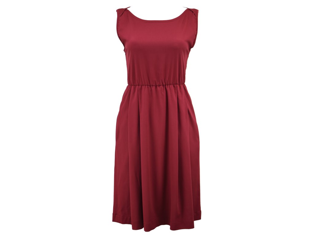 Dámské šaty mírně prodloužené délky s podkasáním v pase. Vrchní díl je volnější, ramínka mají zajímavý prvek překřížení. Sukně je široká a volná s osmi velkými sklady. Šaty mají skryté kapsy v bocích.