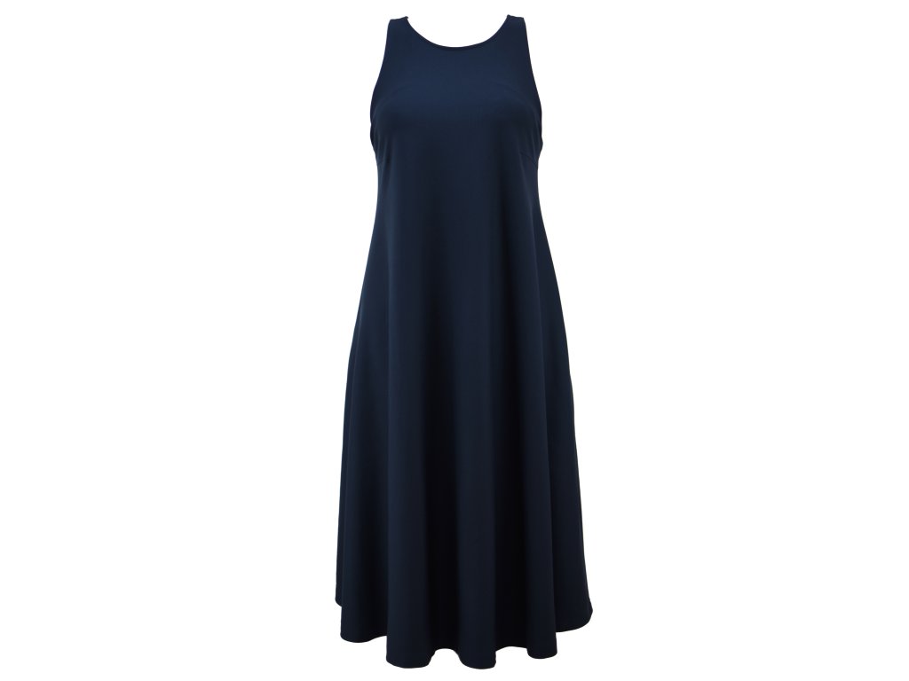 Dámské široké áčkové šaty s prsními záševky, výstřih a průramky jsou začištěné podsádkami, dvě skryté kapsy v bocích. Průramky jsou dostatečně hluboké, aby se daly podvlékat tričkem. Výrazně rozšířený áčkový střih v dolní části, přes hrudník upnuté.