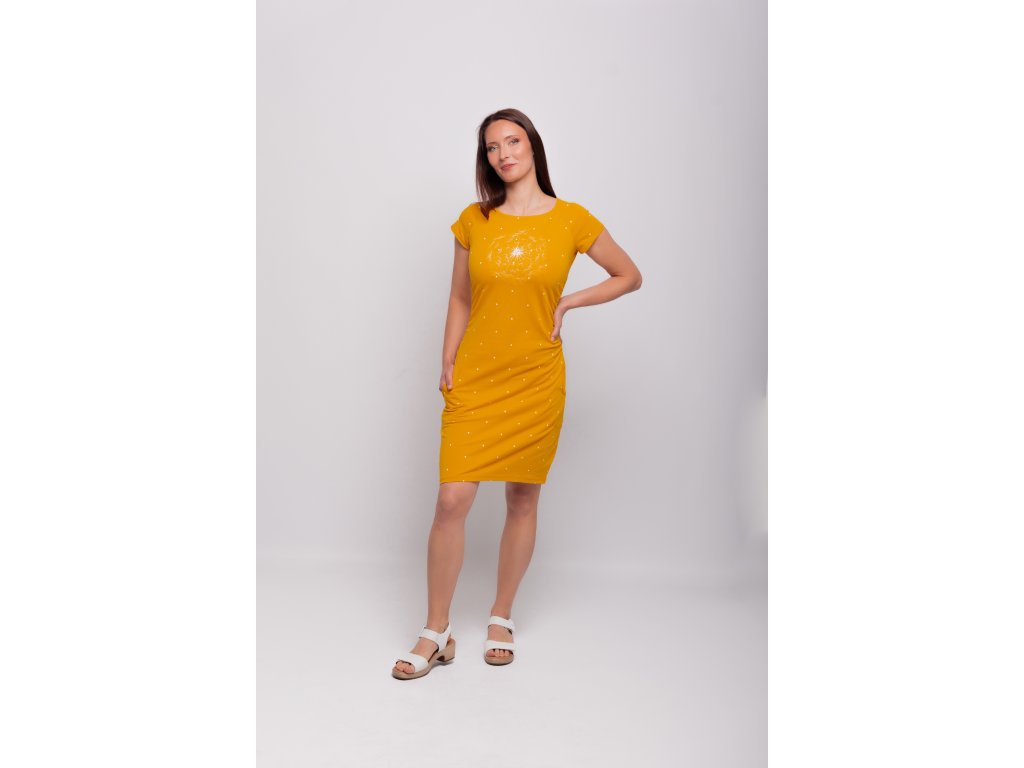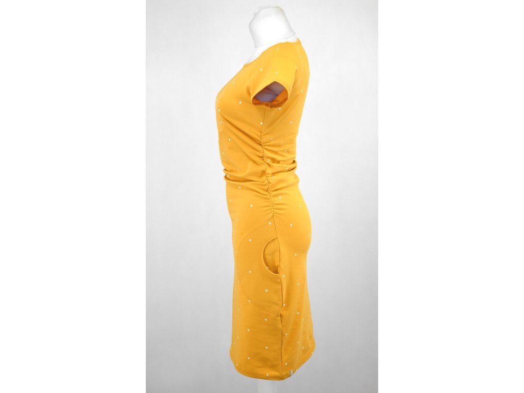 Dámské šaty s řasením v pase, vhodné na denní nošení i formálnější události. Raglánové krátké rukávy. Šaty mají dvě přiznané kapsy v bocích.