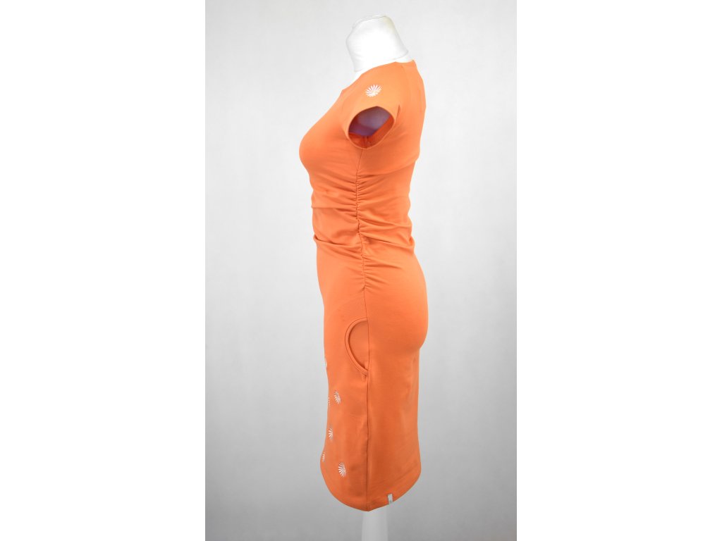 Dámské šaty s řasením v pase, vhodné na denní nošení i formálnější události. Raglánové krátké rukávy. Šaty mají dvě přiznané kapsy v bocích.