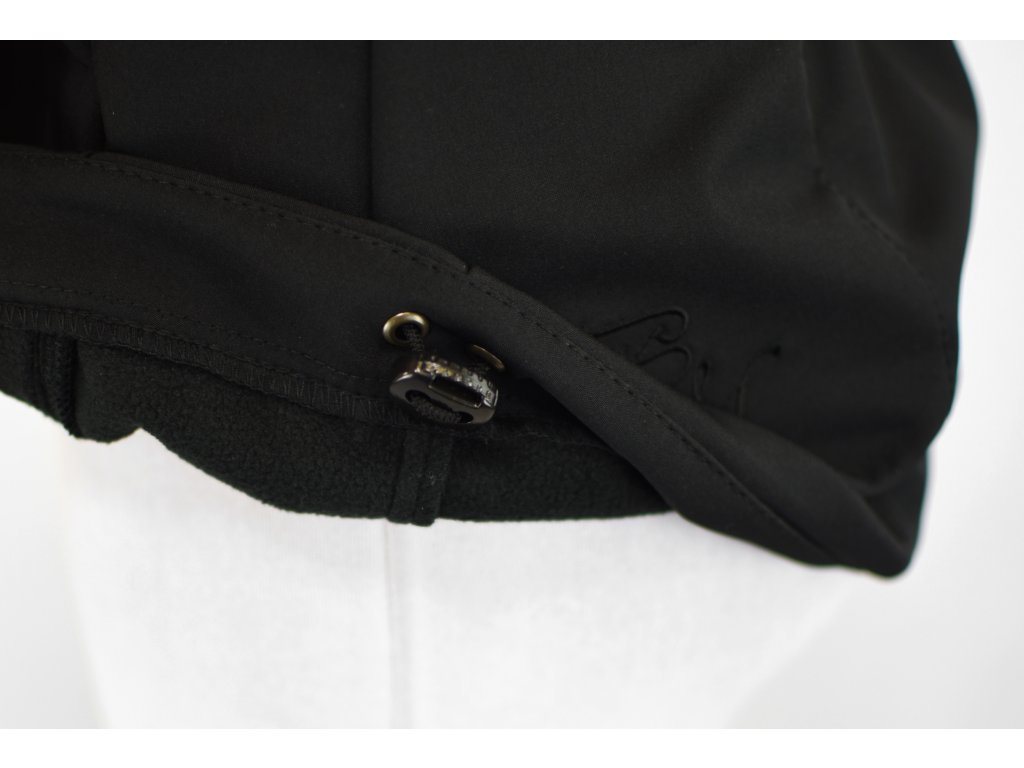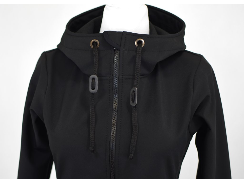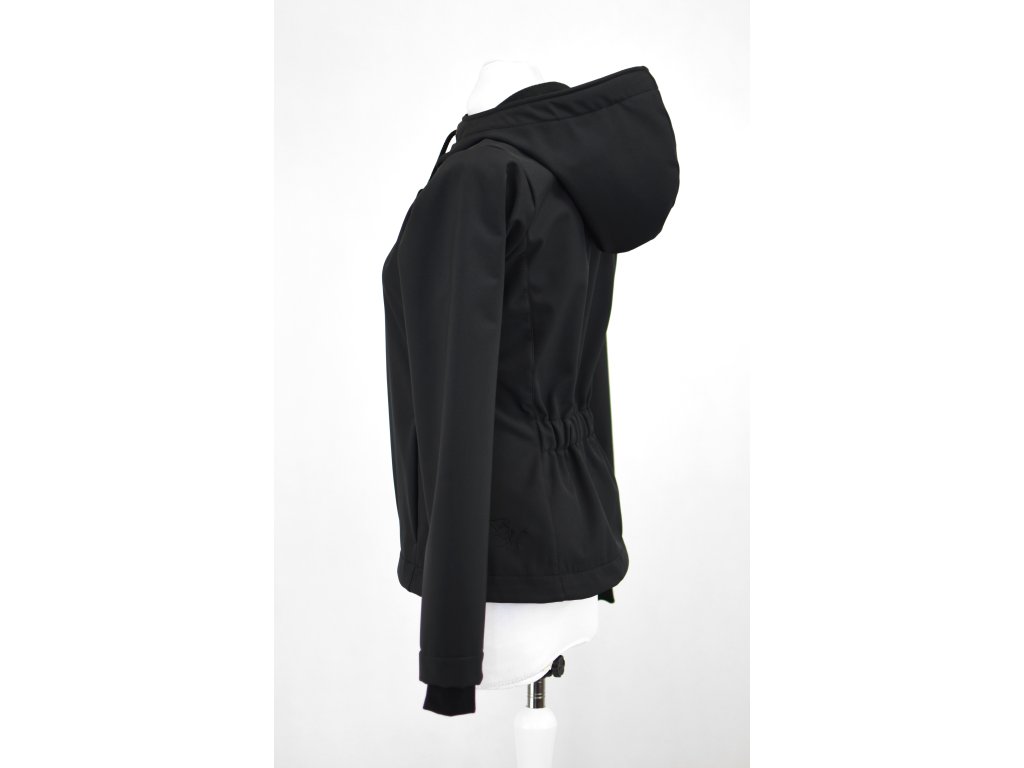 Dámská softshellová bunda, mírně projmutá do pasu. Zadní díl je stažený do pevně všité gumy. V dolním okraji se dá stáhnout gumičkou na obou stranách. Přední část bundy je kratší, zadní lehce prodloužená. Bunda má oboucestný zip, kapsy na zip - všité na předním díle. Bunda je bez podšívky, z rubu slabší fleece.