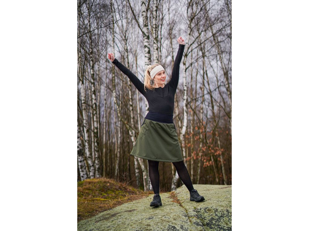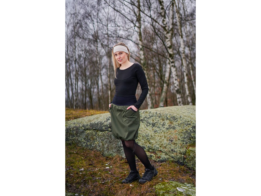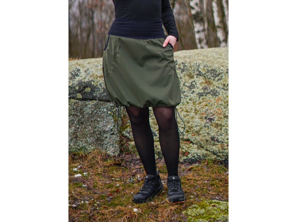 Dámská softhellová sukně áčkového střihu se stažením do gumičky v dolním okraji. Pas je tvořen dvojitým elastickým pasovým okrajem vhodným pro většinu velikostí. Z rubu elastického pasu je nechán otvor na případné vložení gumy na zpevnění či stažení pasu – vhodné pro velikost XS. Sukně má 2 přiznané kapsy v bocích olemované úpletem. Sukni můžete nosit nestaženou, anebo ji stáhnout gumičkou do balonového střihu. Materiál je elastický softshell vhodný pro aktivní pohyb. Z rubu má slabší fleece.