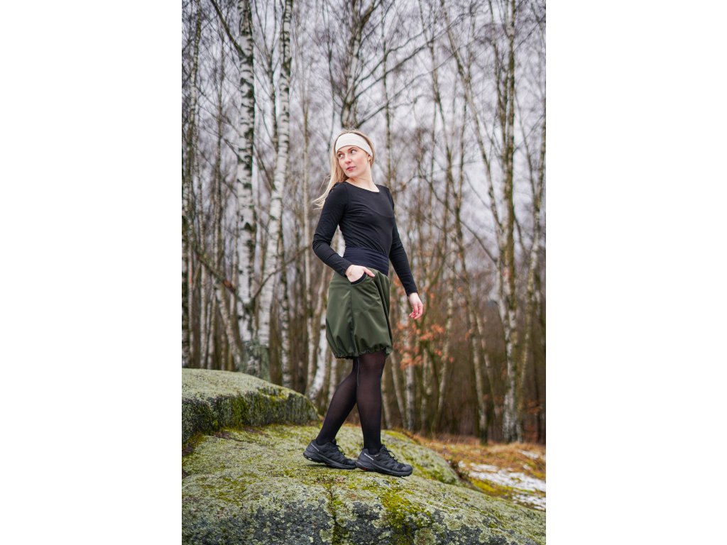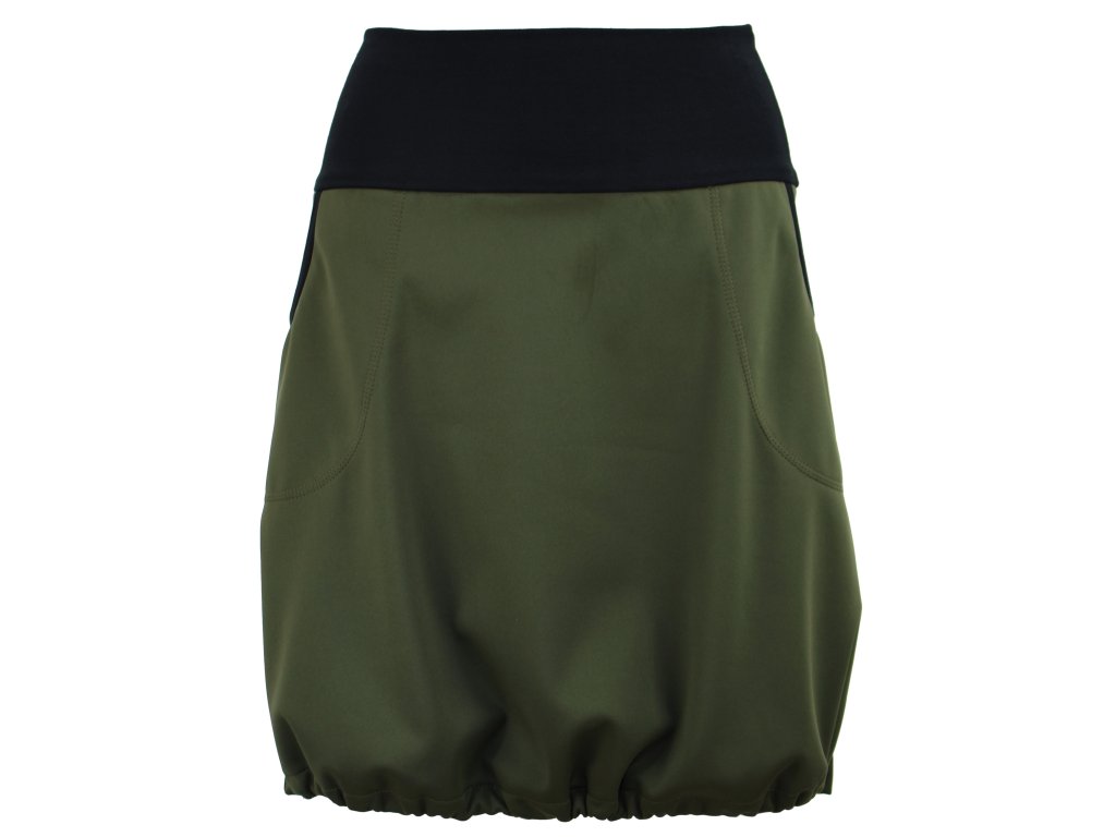 Dámská softhellová sukně áčkového střihu se stažením do gumičky v dolním okraji. Pas je tvořen dvojitým elastickým pasovým okrajem vhodným pro většinu velikostí. Z rubu elastického pasu je nechán otvor na případné vložení gumy na zpevnění či stažení pasu – vhodné pro velikost XS. Sukně má 2 přiznané kapsy v bocích olemované úpletem. Sukni můžete nosit nestaženou, anebo ji stáhnout gumičkou do balonového střihu. Materiál je elastický softshell vhodný pro aktivní pohyb. Z rubu má slabší fleece.
