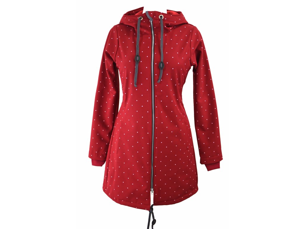 Dámský kabátek rovnějšího prodlouženého střihu s projmutým pasem, který hlavně tvaruje napevno všitá guma na zádech ve středu zadního dílu. Záda jsou nepatrně delší než přední část, spodek zadního dílu se lehce rozšiřuje a dolní lem je dokulata. Ve členícím švu v oblasti boků jsou dvě všité kapsy - kapsový váček a kapsový průhmat je částečně ze softshellu a částečně z bavlněného úpletu, největší kapsy, co jsme doposud u kabátků měli... :)
