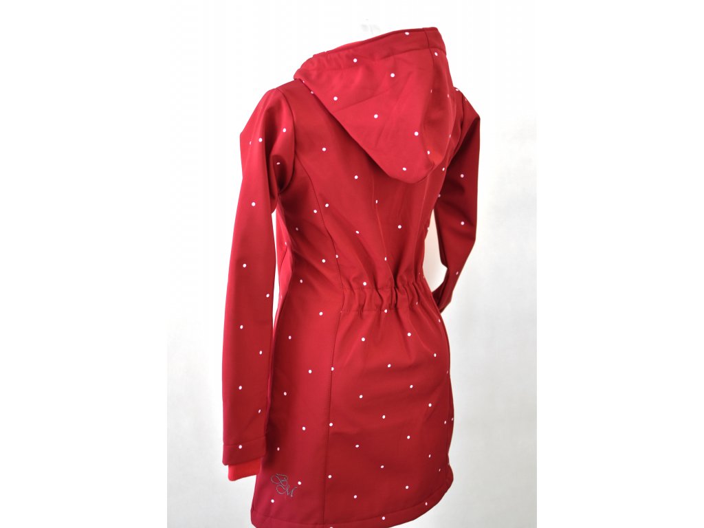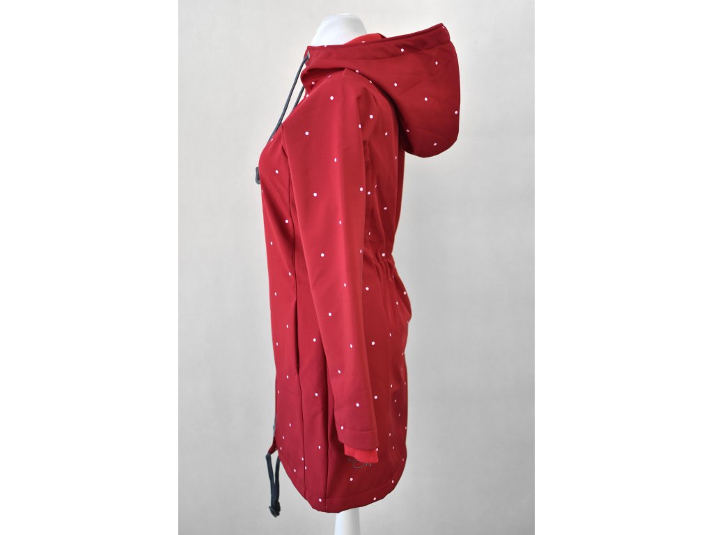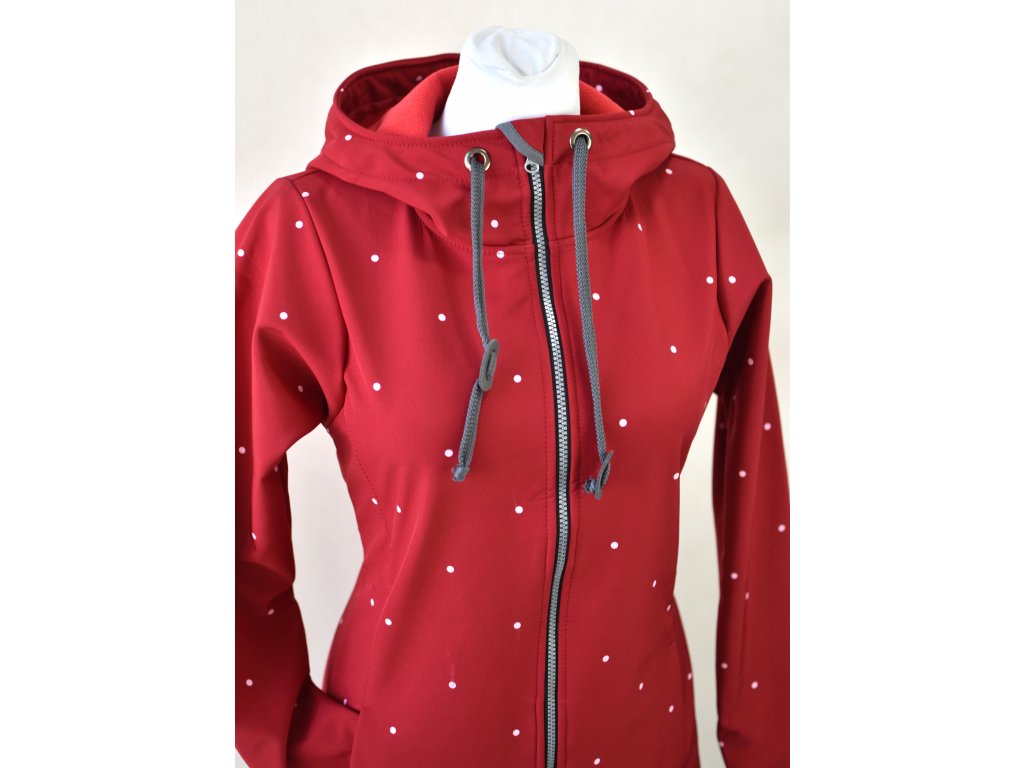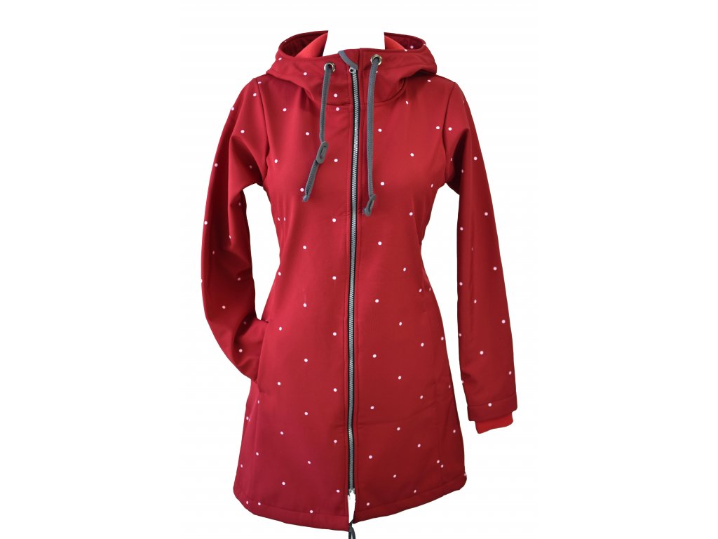 Dámský kabátek rovnějšího prodlouženého střihu s projmutým pasem, který hlavně tvaruje napevno všitá guma na zádech ve středu zadního dílu. Záda jsou nepatrně delší než přední část, spodek zadního dílu se lehce rozšiřuje a dolní lem je dokulata. Ve členícím švu v oblasti boků jsou dvě všité kapsy - kapsový váček a kapsový průhmat je částečně ze softshellu a částečně z bavlněného úpletu, největší kapsy, co jsme doposud u kabátků měli... :)