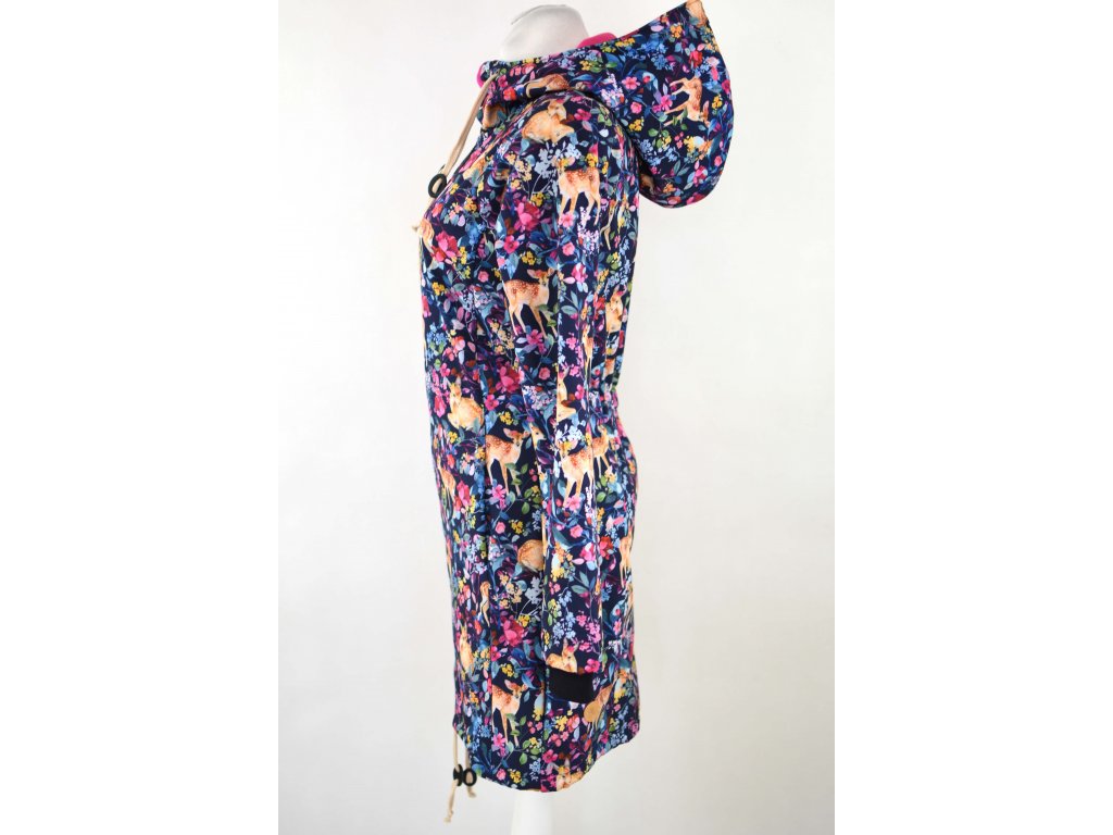 Dámský kabátek rovnějšího prodlouženého střihu s projmutým pasem, který hlavně tvaruje napevno všitá guma na zádech ve středu zadního dílu. Záda jsou nepatrně delší než přední část, spodek zadního dílu se lehce rozšiřuje a dolní lem je dokulata. Ve členícím švu v oblasti boků jsou dvě všité kapsy - kapsový váček a kapsový průhmat je částečně ze softshellu a částečně z bavlněného úpletu, největší kapsy, co jsme doposud u kabátků měli... :)