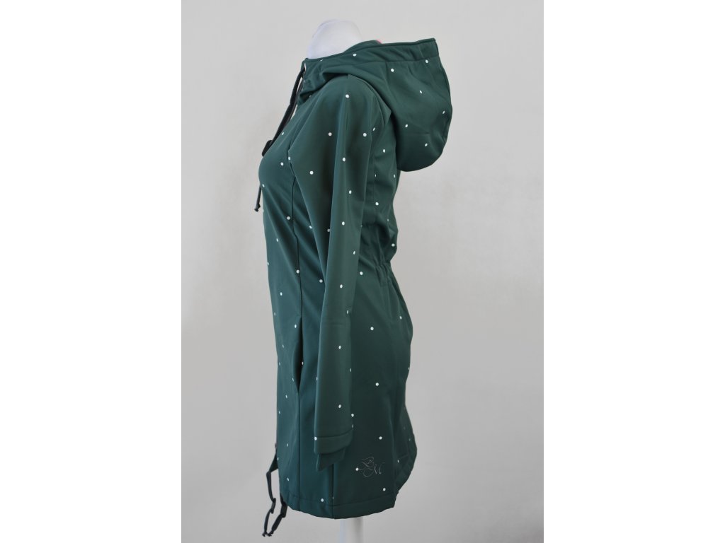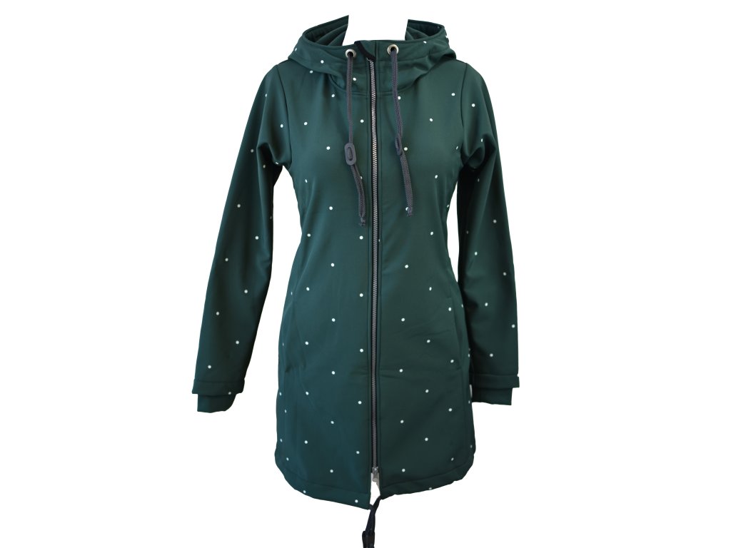 Dámský softshellový kabátek s fleecem v rubu rovnějšího prodlouženého střihu s projmutým pasem, který hlavně tvaruje napevno všitá guma na zádech ve středu zadního dílu. Záda jsou nepatrně delší než přední část, spodek zadního dílu se lehce rozšiřuje a dolní lem je dokulata. Ve členícím švu v oblasti boků jsou dvě všité kapsy - kapsový váček a kapsový průhmat je částečně ze softshellu a částečně z bavlněného úpletu, největší kapsy, co jsme doposud u kabátků měli... :)