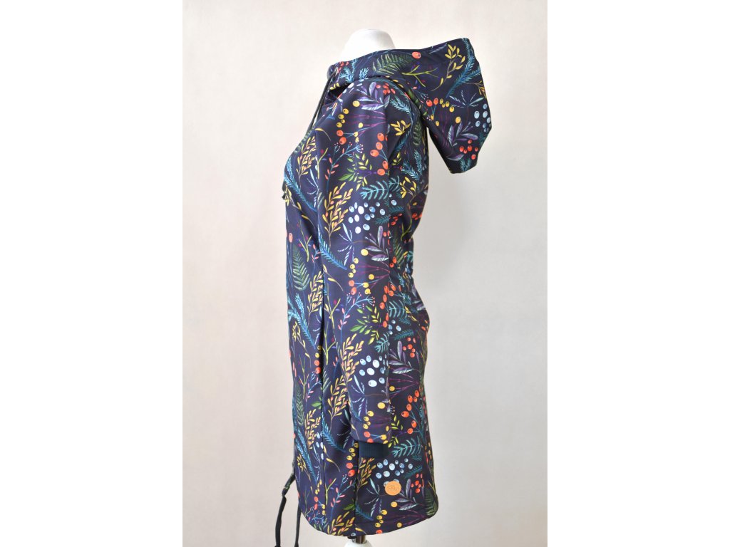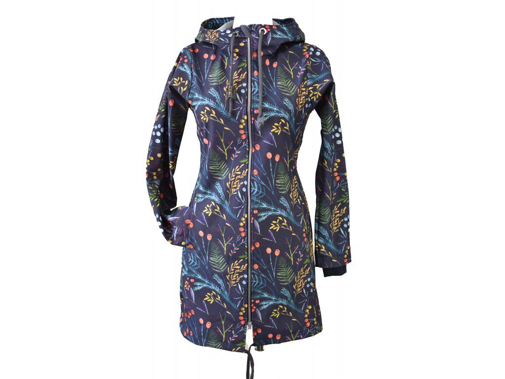 Dámský kabátek rovnějšího prodlouženého střihu s projmutým pasem, který hlavně tvaruje napevno všitá guma na zádech ve středu zadního dílu. Záda jsou nepatrně delší než přední část, spodek zadního dílu se lehce rozšiřuje a dolní lem je dokulata. Ve členícím švu v oblasti boků jsou dvě všité kapsy - kapsový váček a kapsový průhmat je částečně ze softshellu a částečně z bavlněného úpletu, největší kapsy, co jsme doposud u kabátků měli... :)