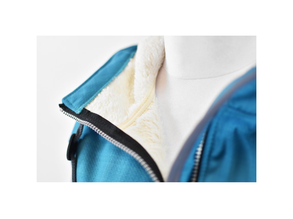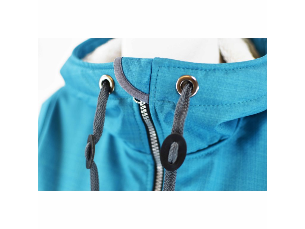 Kapuce je taktéž větší a praktičtější, dá se stáhnout šňůrkami, které jsou zakončeny koženkou. Zip je oboucestný a je u límce oddělen chráničem brady. Kabátek se dá opět stáhnout v dolní části gumičkami, je pak podkasanější - šňůrky s koženkou dole pod zipem tvoří jen praktický prvek pro svázání cípů, ty nemají stahující funkci.