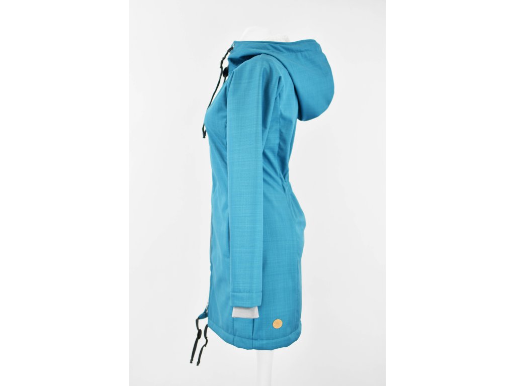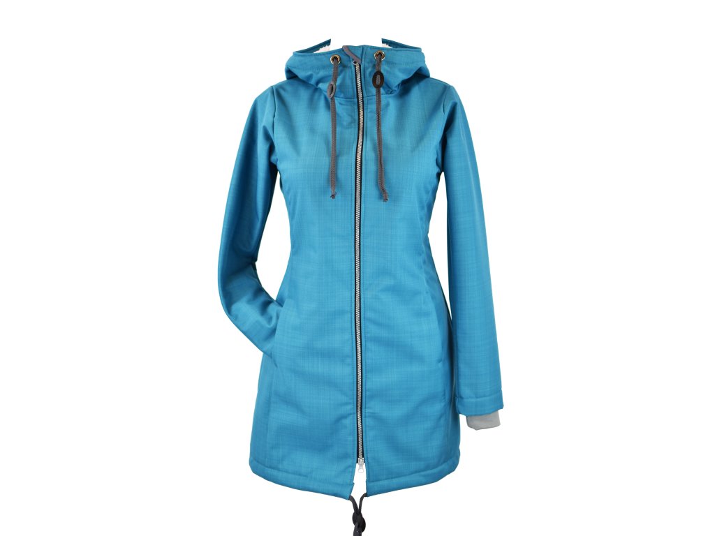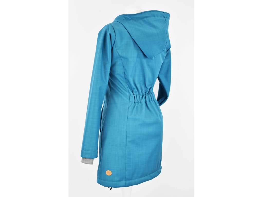 Dámský kabátek rovnějšího střihu s projmutým pasem, který hlavně tvaruje napevno všitá guma na zádech ve středu zadního dílu. Ve členícím švu v oblasti boků jsou dvě všité kapsy - kapsový váček a kapsový průhmat je částečně ze softshellu a částečně z bavlněného úpletu, největší kapsy, co jsme doposud u kabátků měli... :)