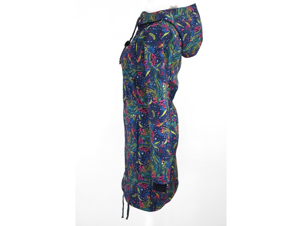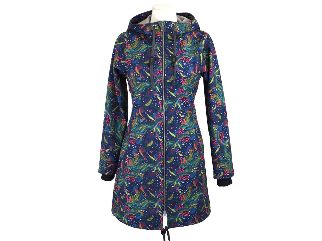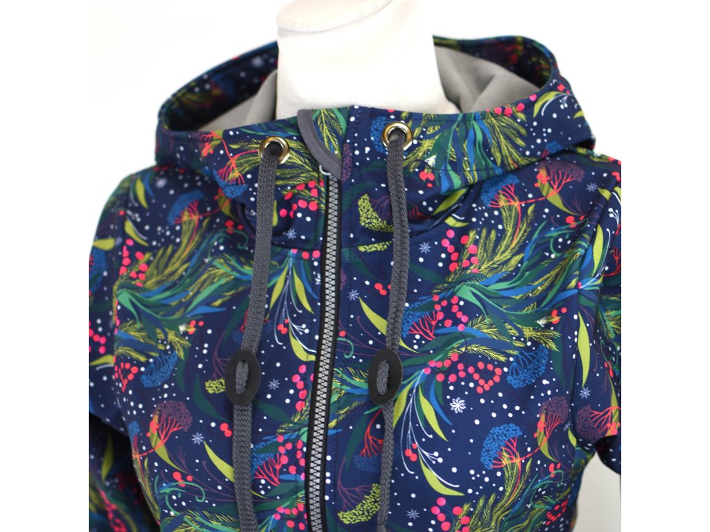 Dámský kabátek rovnějšího prodlouženého střihu s projmutým pasem, který hlavně tvaruje napevno všitá guma na zádech ve středu zadního dílu. Záda jsou nepatrně delší než přední část, spodek zadního dílu se lehce rozšiřuje a dolní lem je dokulata. Ve členícím švu v oblasti boků jsou dvě všité kapsy - kapsový váček a kapsový průhmat je částečně ze softshellu a částečně z bavlněného úpletu, největší kapsy, co jsme doposud u kabátků měli... :)