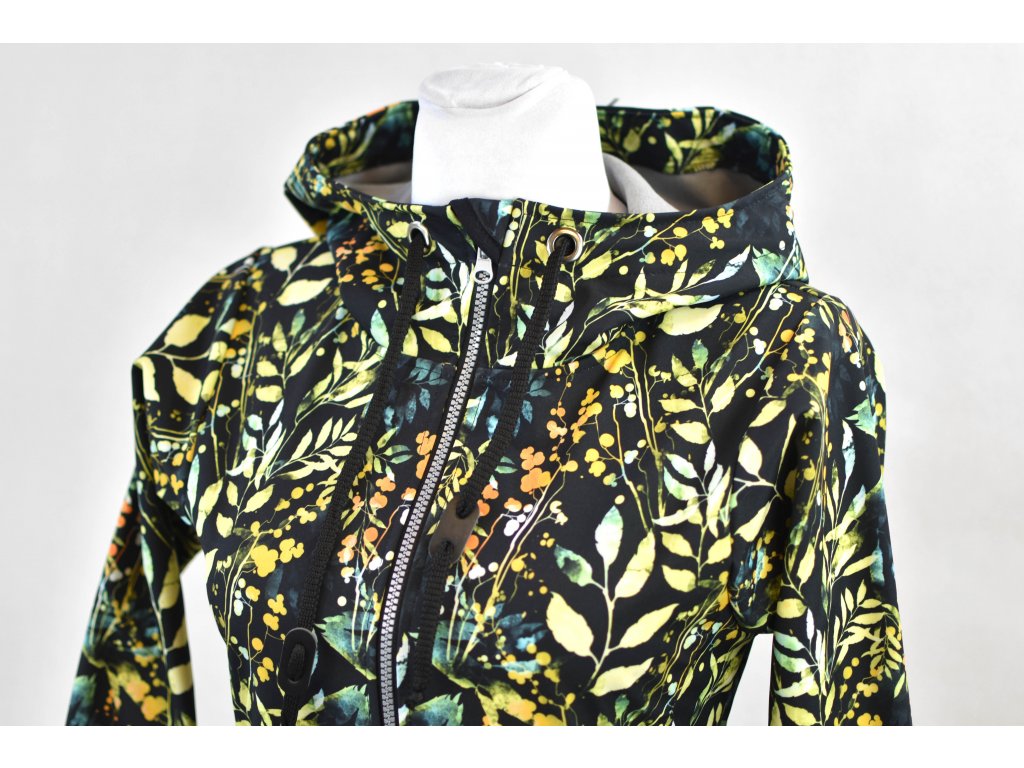 Dámský kabátek rovnějšího prodlouženého střihu s projmutým pasem, který hlavně tvaruje napevno všitá guma na zádech ve středu zadního dílu. Záda jsou nepatrně delší než přední část, spodek zadního dílu se lehce rozšiřuje a dolní lem je dokulata. Ve členícím švu v oblasti boků jsou dvě všité kapsy - kapsový váček a kapsový průhmat je částečně ze softshellu a částečně z bavlněného úpletu, největší kapsy, co jsme doposud u kabátků měli... :)