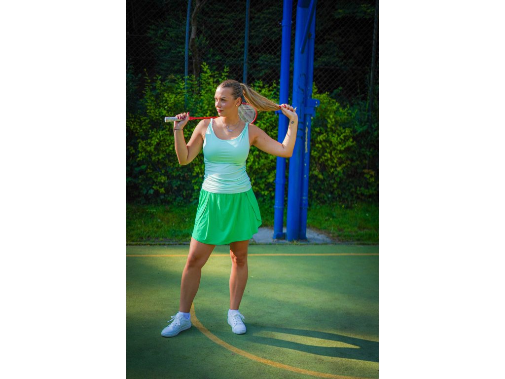 Dámská sportovní sukně rovného střihu s efektem zavinutí. Ten je tvořen překlady látky na bocích, které umožňují volný pohyb nohou. Nově jsme přidali taky malé poutko na klíče. V pase sukně jsou všité kratší kraťásky s příjemné slabé viskózy... :)