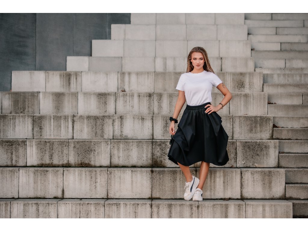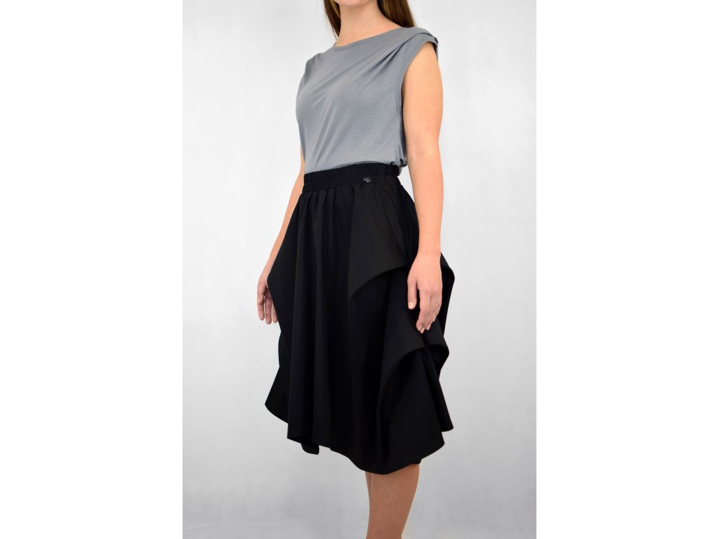 Dámská sukně půlkolového střihu se symetrickými sklady na obou bocích. Ty tvoří tři cípy a dělají na sukni zajímavý prvek s bohatým objemem. V pase má skrytou prošitou gumu, v bocích jsou dvě skryté kapsy. Délka je lehce asymetrická, zadní díl je o 5 cm delší.